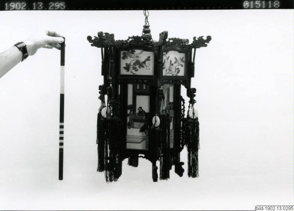 Kinesisk lykta, sexkantig, ramverk av svart trä, målade glas med figurframställningar. Hängen av grönt silke. (generalkatalog)