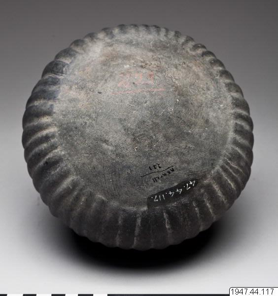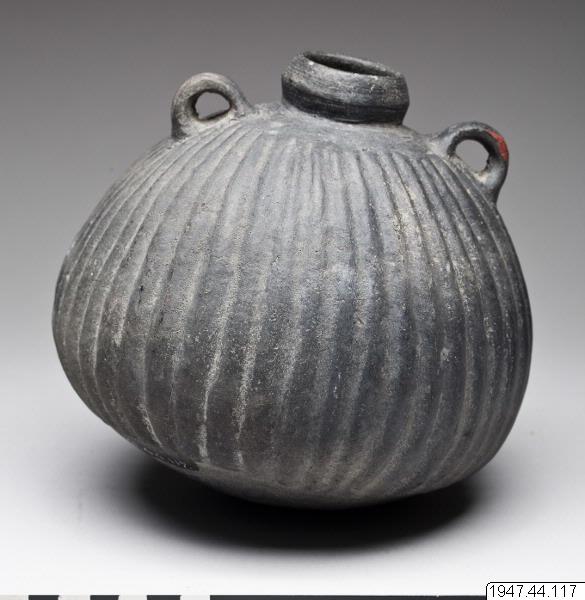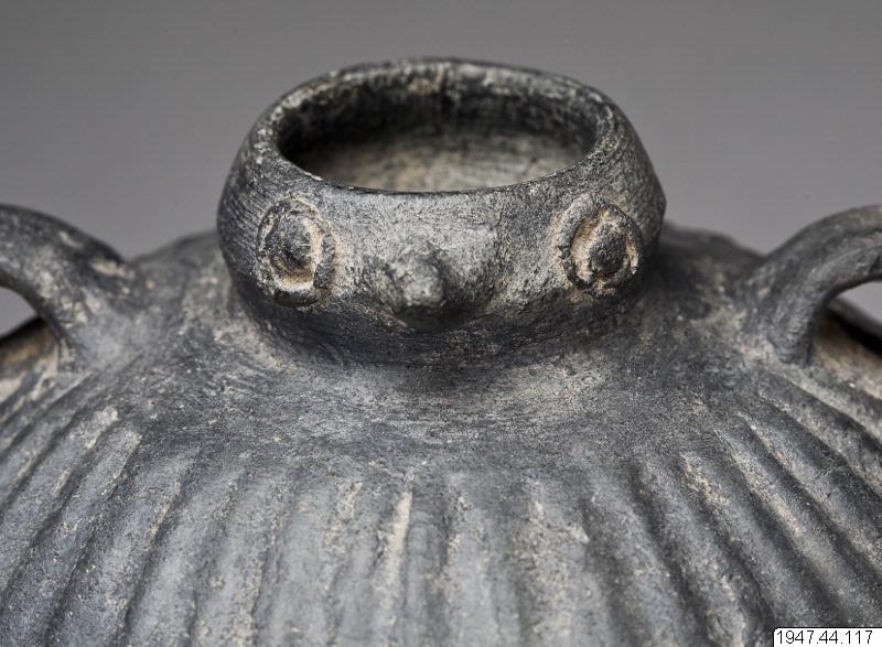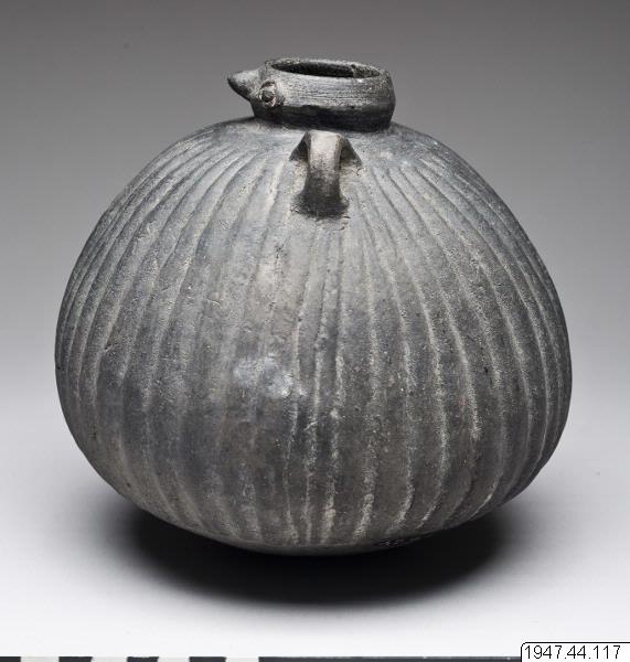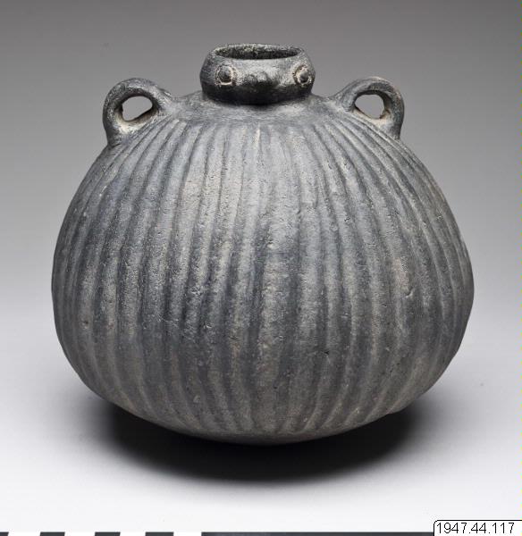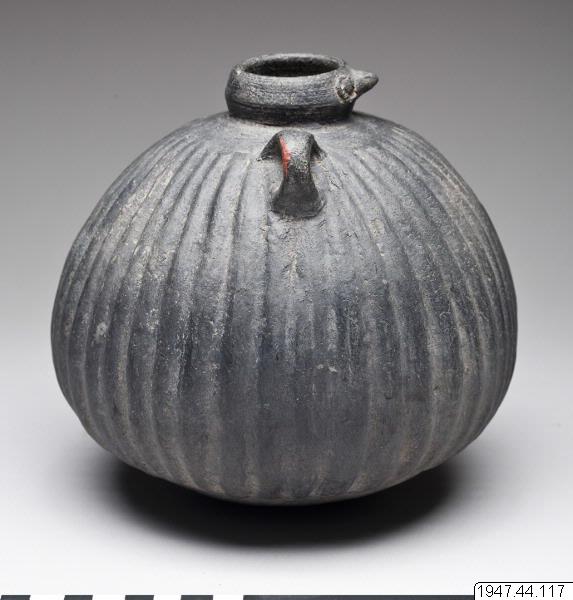 Gravkärl av lergods. Svartkeramik, grå (ej fernissad). I form av en frukt vars skal har täta parallella åsar. På den låga mynningshalsen en näsa och ögon. Två små handtag. Chimu- eller Tallankultur.