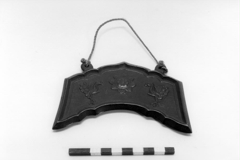 Klangplatta för religiöst ändamål, att hänga i silkessnodd, med dekor av svårdefinierbara fåglar (tranor, ev. fenixfåglar) samt sköldpaddsliknande mönster. Dessutom finns text på sidan skriven i mörkbrunt.