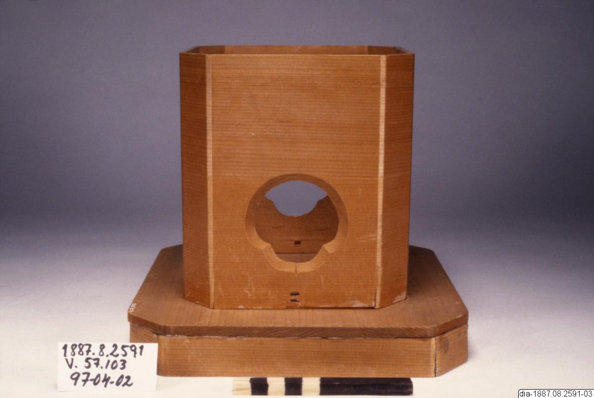 Delsamling 1887.8.2489-2867 är inköpt i Tokyo och består av sandaler, skor, handdukar, ätpinnar, symboliska svärd, många rituella och religiösa föremål och figurer, klädedräkter mm. (PH 960506)