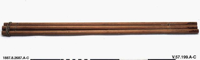 av trä. Består av 3 st. runda käppar, som nedtill äro förenade ned snören, som tillåta att käpparna spärras ut c. 34 cm och bilda en trefot. Upptill, ca. 11,5 cm från topparna äro de förenade med kort snöre. När käpparna äro utspärrade bildas ett litet ställ upptill , på vilket en lampskål kan ställas. Uppges vara "gammal form". (Orig.kat. nr. V.57. 199) Käpparnas längd: 76 cm. Tokio [ocr]