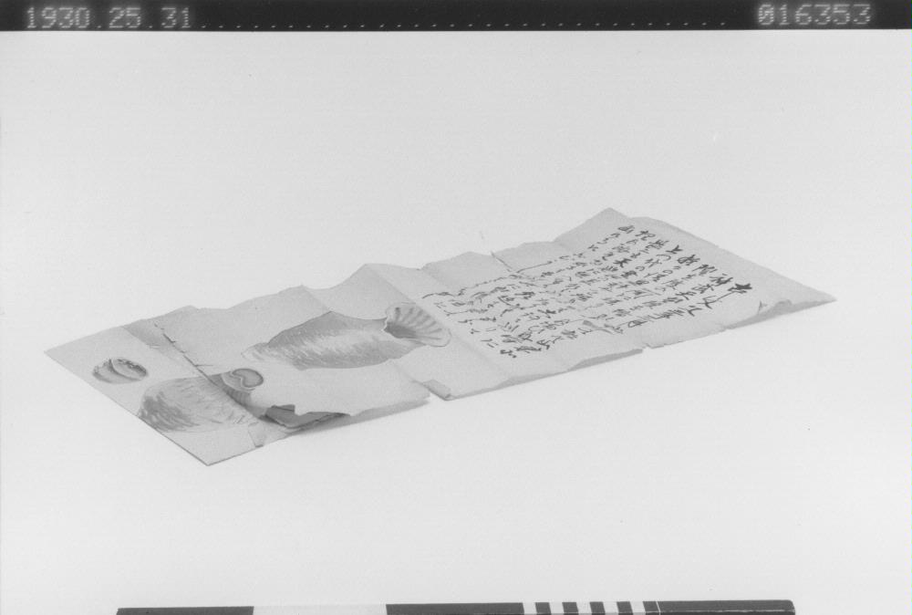 Akvarell och tuschtext återgivande ett par föremål uppgrävda från kejsar Jimmus grav vid Kashiwabara i Yamato-provinsen. Denne kejsare regerade enligt sägnen 660-585 f v t, men det finns inga bevis för den exakta tiden. Han skulle vara Japans förste kejsare. Han omtalas (givetsvis) i Nihongi och Kojiki från 700-talet, de första historiska böckerna i Japan.