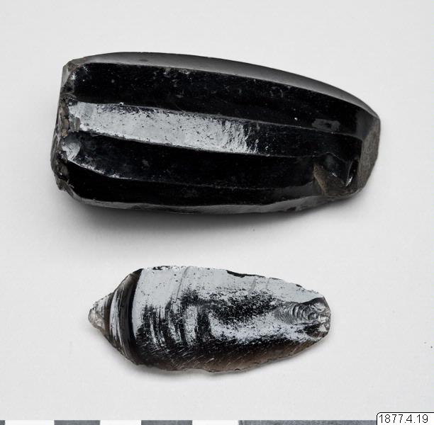• Ett stycke obsidian, av vilket spånor avslagits till pilspetsar.