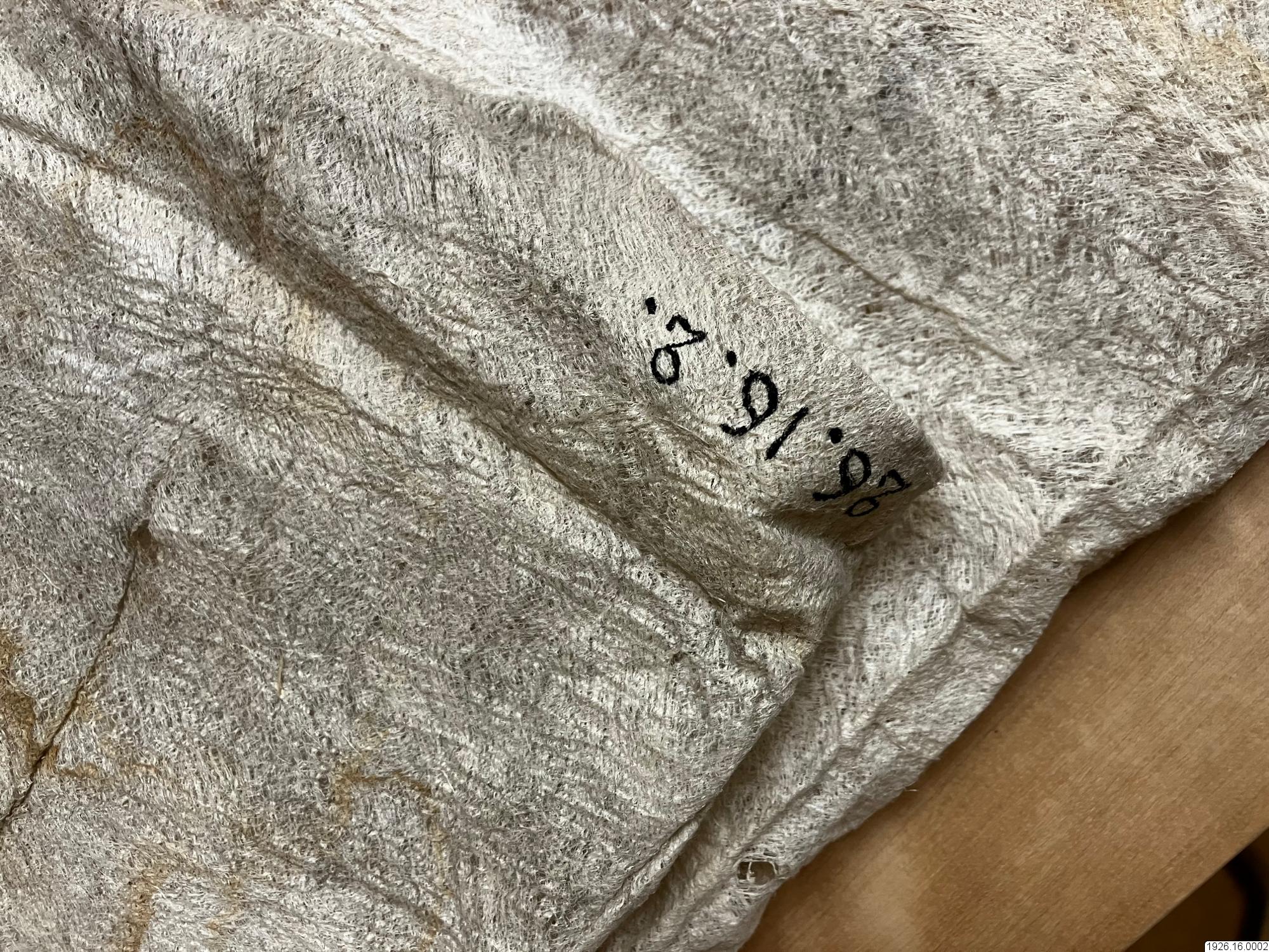 • Rektangulärt delvis mycket tunnt vitt s.k. barktyg av utbultad innerbark, med många mindre och större kvisthål. [[Textil]]