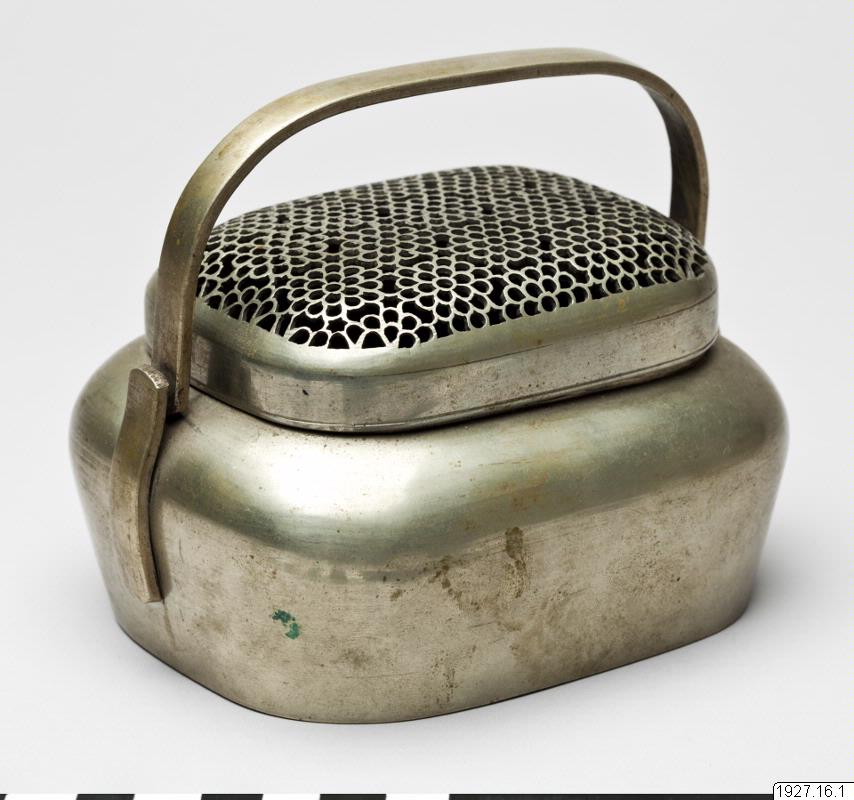 Rökelsekar av mässing med genombruten blomdekor på locket. Med handtag i form av en bygel, ledbart. Enligt Per-Olow Leijon är föremålet från tidigt 1900-tal. Karet är profant och har alltså ej använts för religiöst bruk.