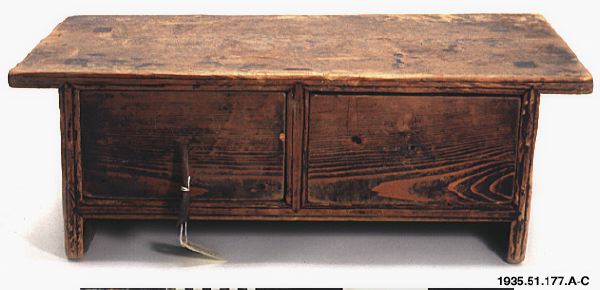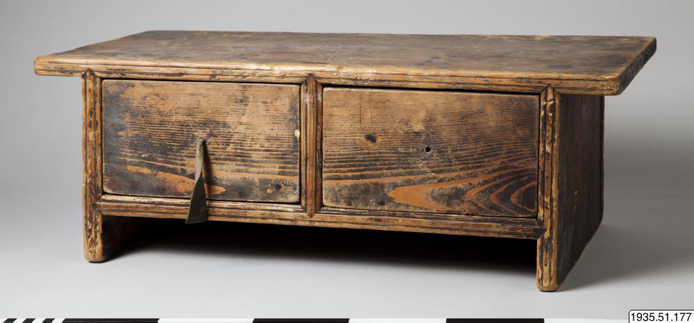 Bord av trä, med två utdragbara lådor. Lådorna har två fack vardera. Den ena lådan har en läderrem som fungerar som handtag. (AA) "Cho tse. K´ang (mud platform) table. These small tables are about the only article of furniture in a Tebbu home. Drawers for tsamba + cheese. Made by local carpenters." (Carlson, 1930)