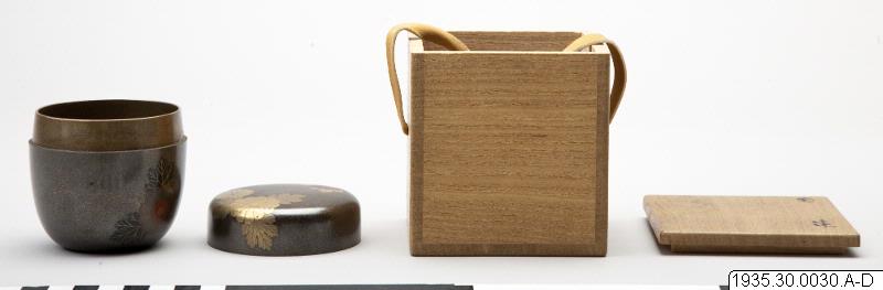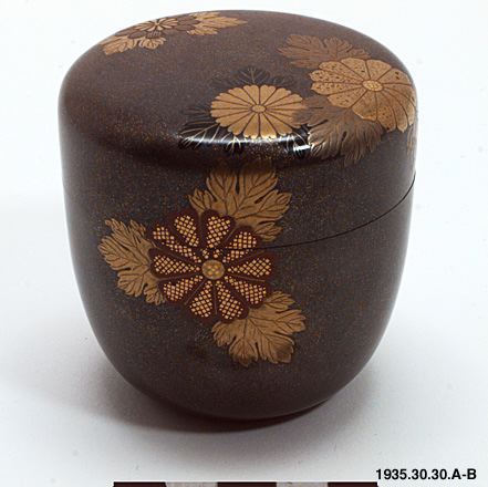 • Tedosa med dekor av olika varianter på stiliserade krysantemumblommor i maki-e ("strödd bild"). Själva grunden är "silvergyllene", dvs i guldpulvret finns inslag av silver. Signerad. (PH)