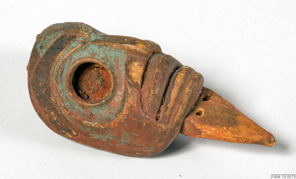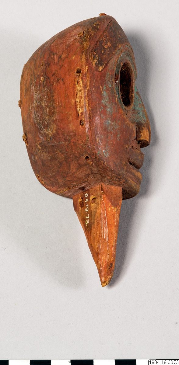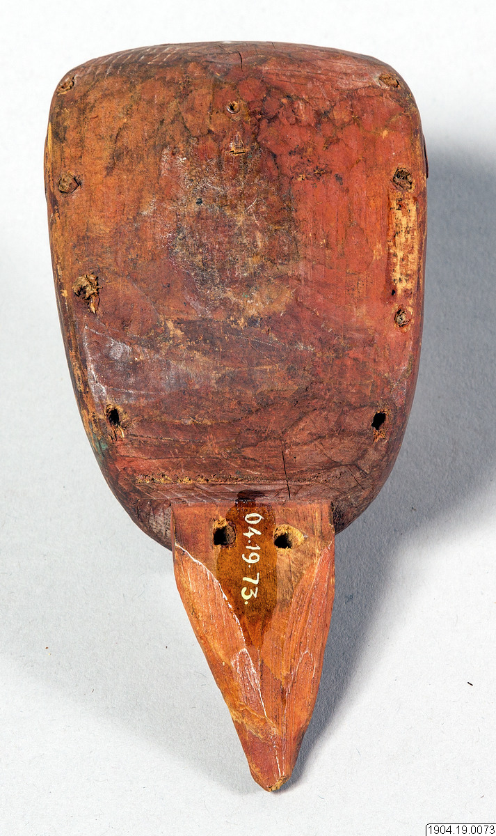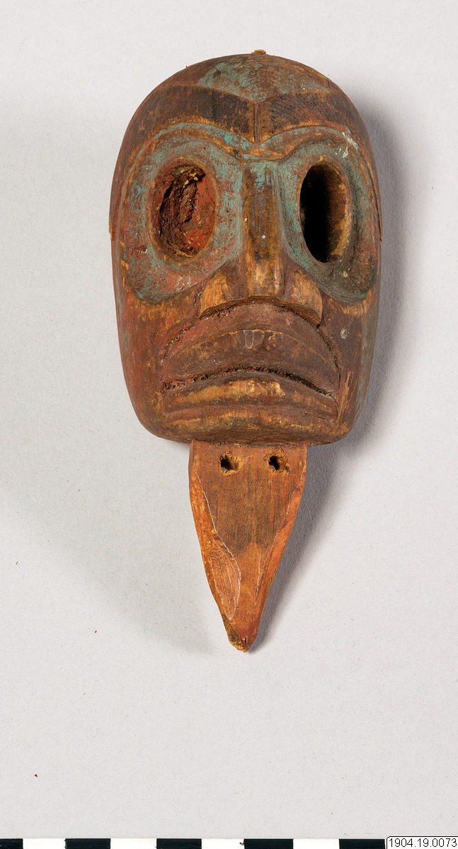 Enligt generalkatalogen är det ett trähuvud, litet. Tillhört en "blanket" för Mitta dansen,(Jacobsens nr 22), med proveniensen, British Columbia, Bella Bella.