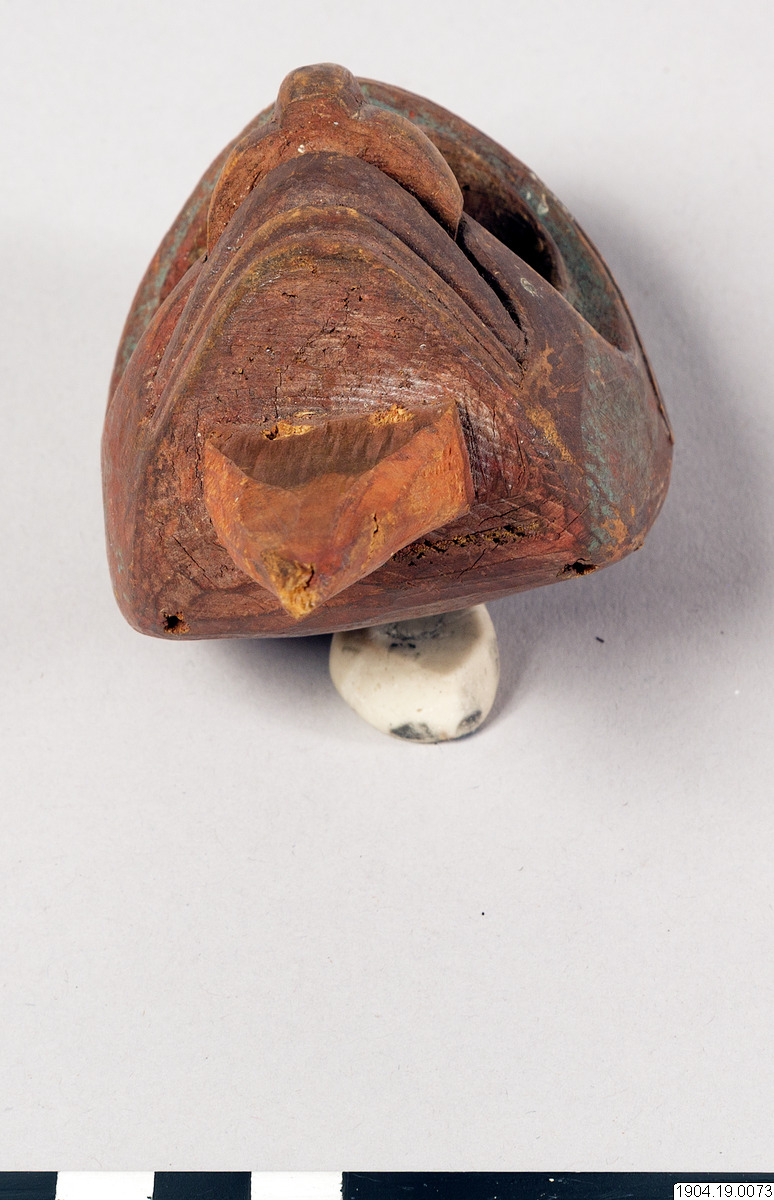 Trähuvud målat i grönt, rött och svart. Färgen är flagad och matt. Träpluggar på det lilla huvudets baksida har troligen tidigare hållit fast någon form av material, troligen något som skulle föreställa hår, eller riktigt hår av något slag. Människohår användes i stor omfattning av nordvästkustindianerna på föremål som detta.