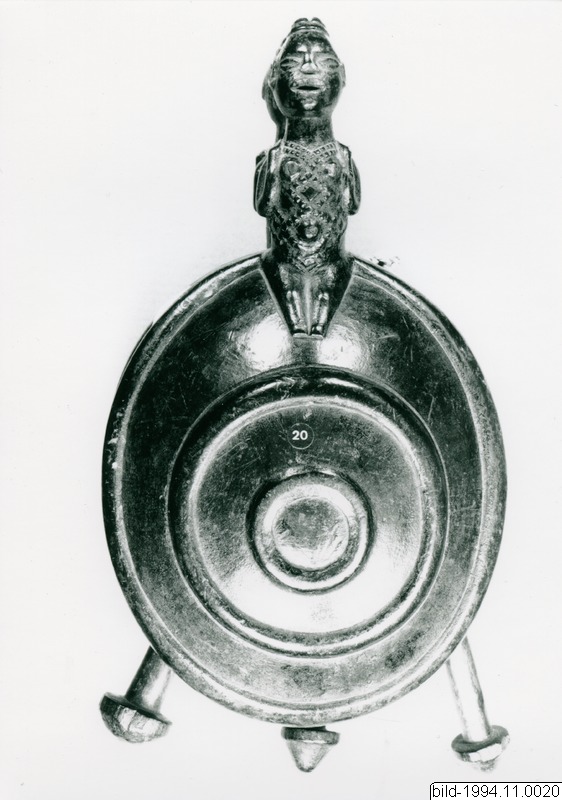 En träklocka med tre tappar i trä och handtaget format som två kvinnofigurer med ryggarna mot varandra. Den här typen av klocka, som är större än de klockor som användes som hundklockor vid jakt, användes av nganga, "läkaren" eller prästen, vid nkisi- eller fetischkulten. Ofta är handtaget skulpterat, vilket det inte är när det rör sig om hundklockor, då är endast ett snöre fäst i överkanten på klockan. Söderberg,1956, s 97-100. Se även 1994.11.371 för mer information om fetisch-kulten i det här området.
