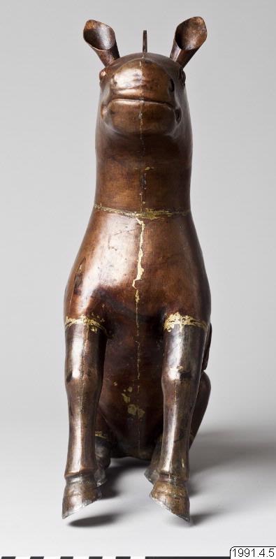 • Takryttare av driven koppar, vilken föreställer en häst. Takryttaren är en kopia av en av de takryttare som pryder Gyllene templet. (AA)