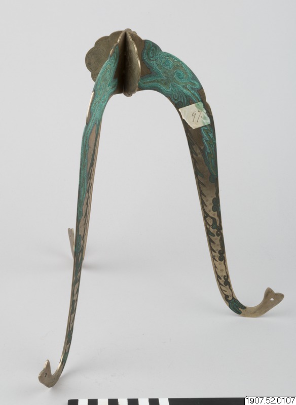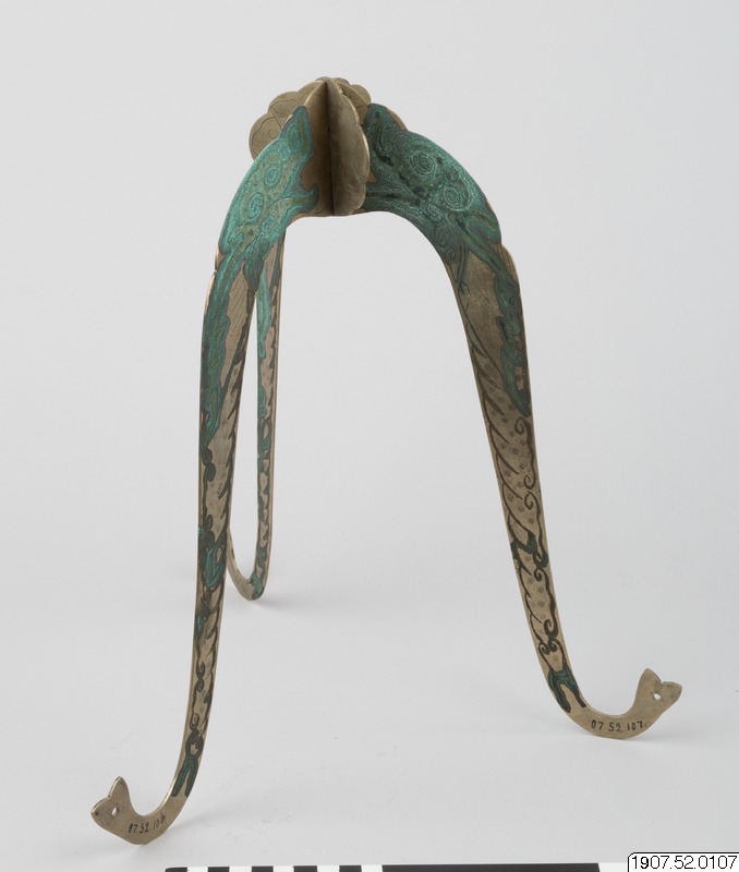 Hattställ av metall på tre ben dekorerade med drakhuvuden. Korroderad.