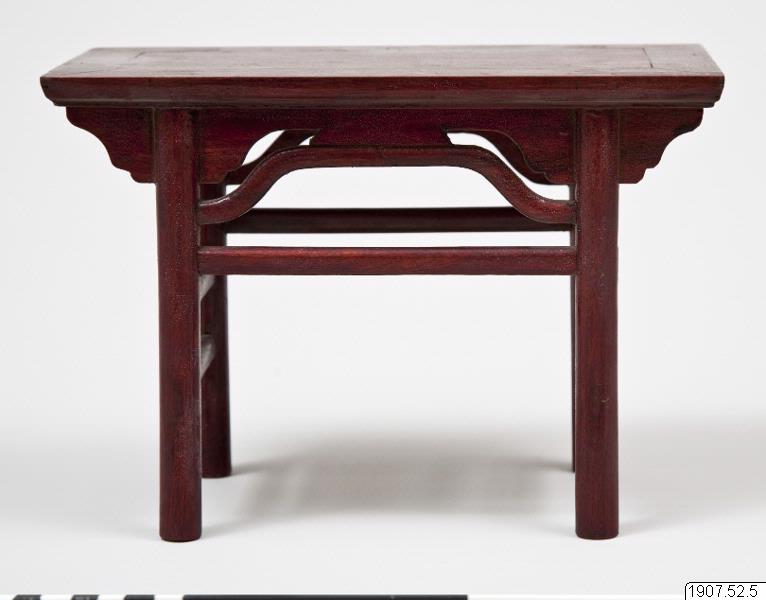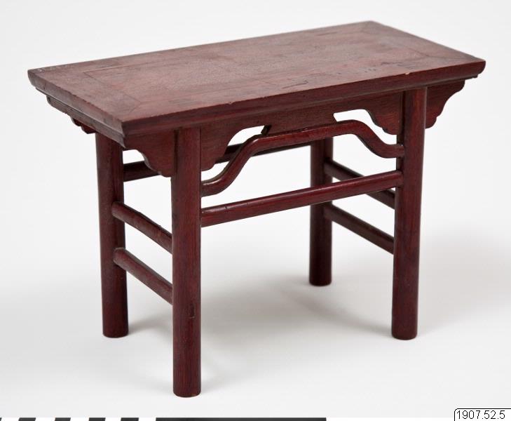 Modell av ett bord i rödlackerat trä.