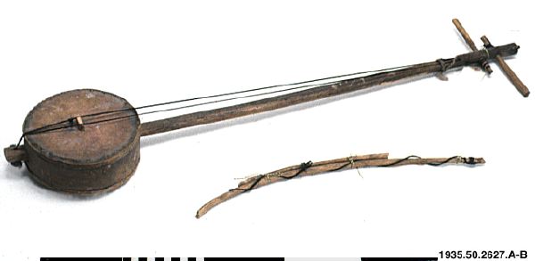 Ett stråkinstrument (mongoliska: khil-khuur), med tillhörande stråke. Instrumentet har en rund resonanslåda av trä och läder, och två strängar av hästtagel. Stråken är av trä och hästtagel, och är i nuvarande skick i två delar. (AA) Teckning: HBE, Teckning av denna khil-khuur från Etsin Gol i Haslund-Christensen. 1943. s.84. fig.2. Foto: Montell. 1934. s. 193
