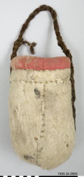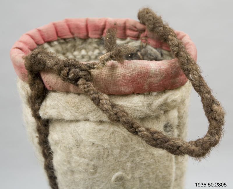 • Väska av tovad ull, med en övre kant av rött tyg, och handtag av tvinnat mörkbrunt hår. (AA)