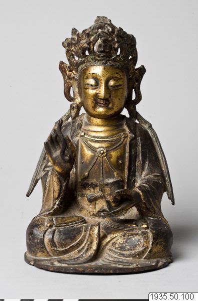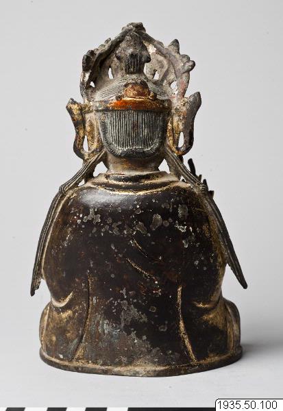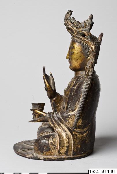 Skulptur: Guanyin āsana: Guanyin är avbildad sittande i meditationsställning (dhyanasana). Mudra och attribut: Guanyin har en skål i sin vänstra hand, och ett smalt föremål i sin högra hand. I kronan finns Amitaha avbildad. Skulpturen är gjuten i brons, hudpartierna är brännförgyllda och dräkten kallförgylld. Rödmålad mun, baksidan mörk. Skulpturen är ihålig underifrån. (AA) Skulpturen är identifierad av Karl Gunnar Gardell. Skulpturen har sannolikt varit försedd med en lös lotustron som nu saknas. (HBE) "Gudabild." (MLK)