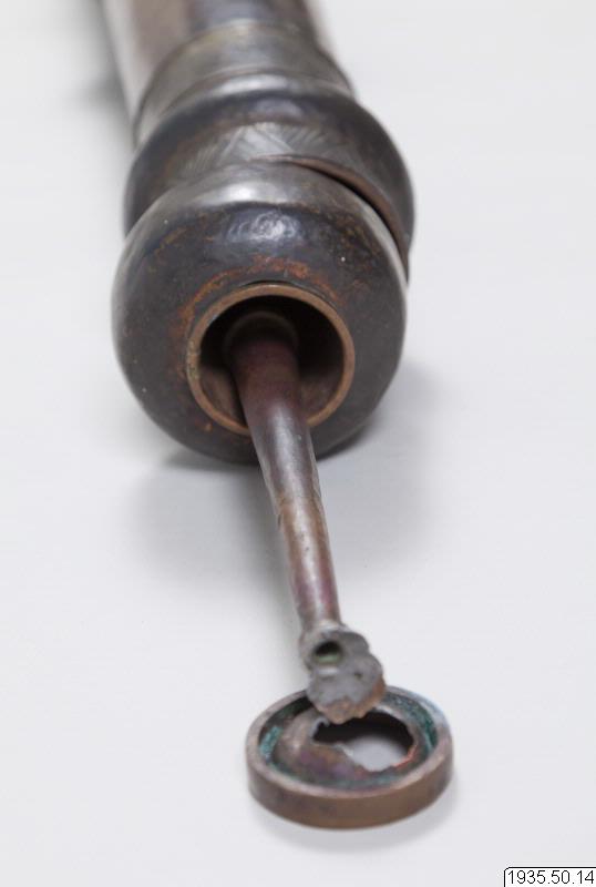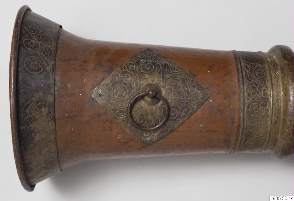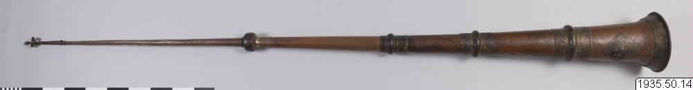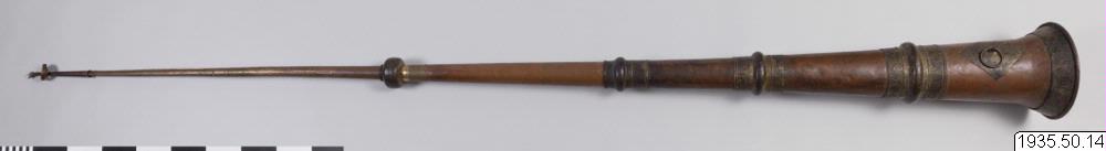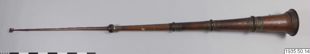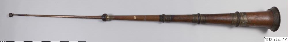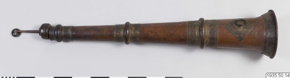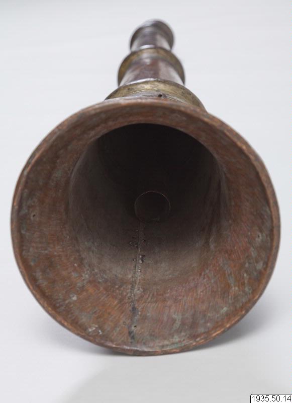 Tempeltrumpet av koppar i tre delar som går att skjuta in i varandra. Nära mynningen en kraftig ring för bärrep. (HBE) Utgör par tillsammans med föremål nr 15. (MLK) Mått: utdragen 296 cm. Mynningsdiametern 26 cm (HBE)