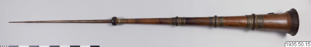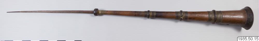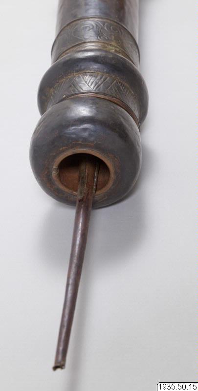 Inköpt i Kwiewa-Cheng 2 november 1929. Trumpeten är från Ja miao i Kweiwa-Cheng. (MLK) Pris: 30 mex dollar. Föremål 14 -15 ingick i priset. (MLK) Ortnamn: Kuei-hua beskrivs av Montell som den helig...
