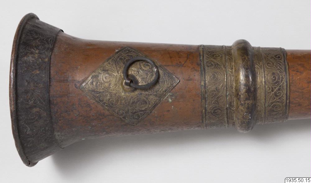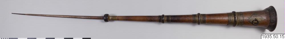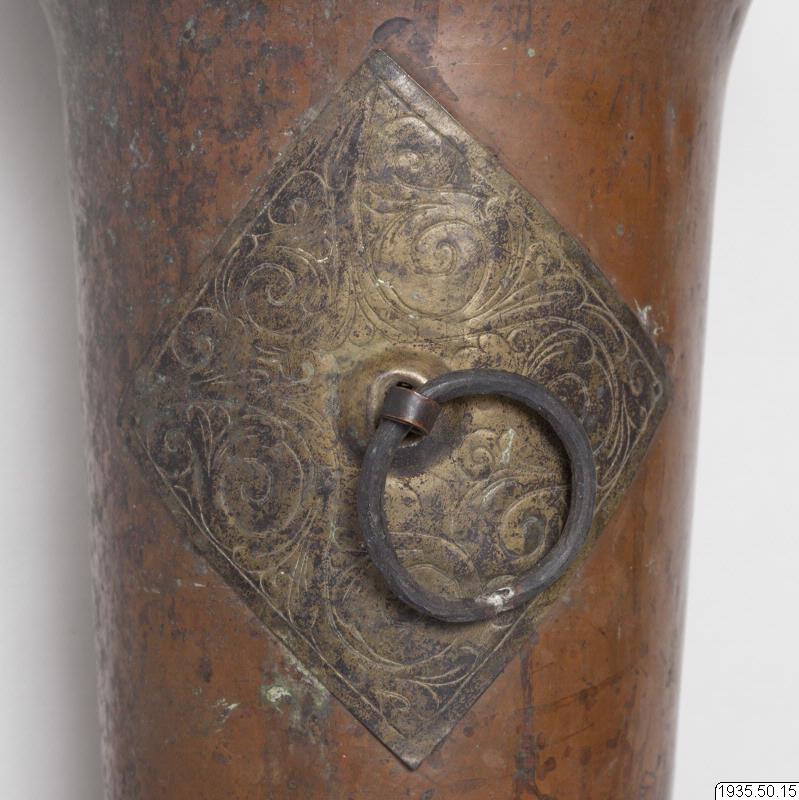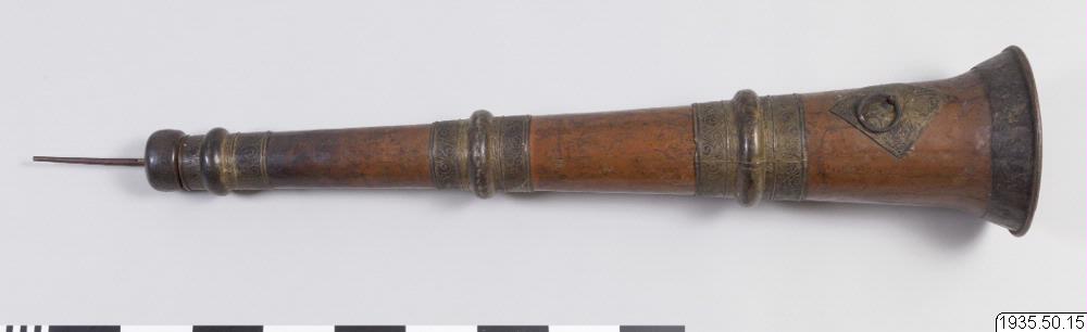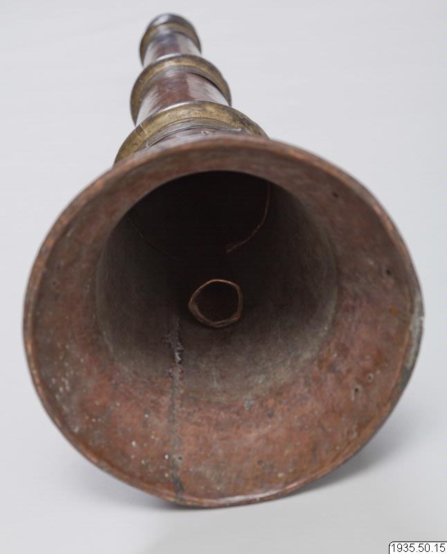 Tempeltrumpet av koppar i tre delar som går att skjuta in i varandra. Nära mynningen en kraftig ring för bärrep. (HBE) Utgör par tillsammans med föremål nr 14. (MLK) Mått: utdragen 296 cm. Mynningsdiametern 26 cm (HBE)
