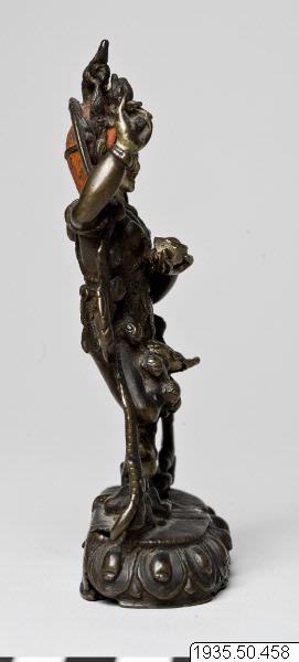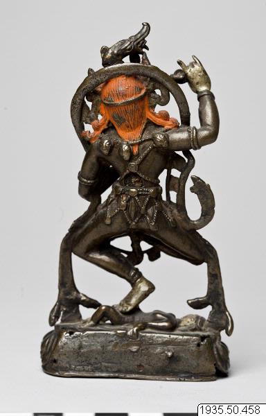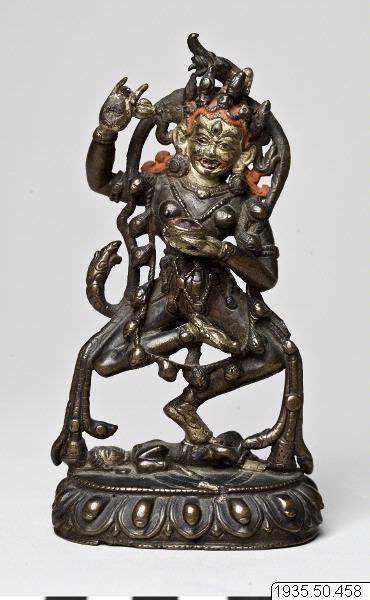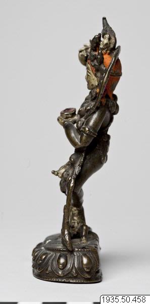 āsana: Hon är avbildad i dansande ställning (ardhaparyankasana) på en människa som ligger på en lotustron.