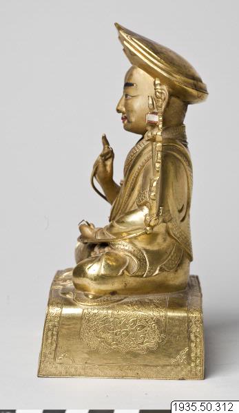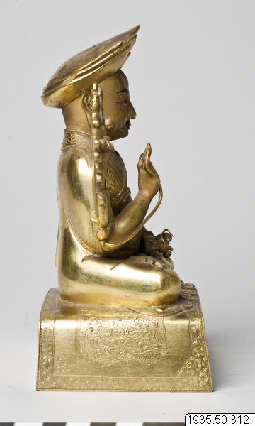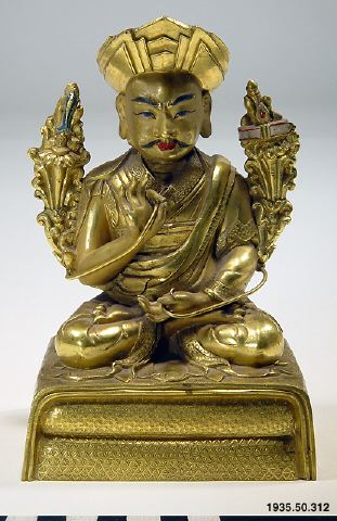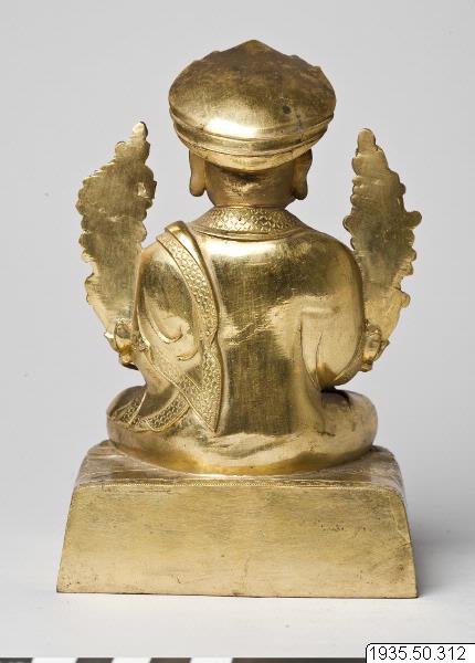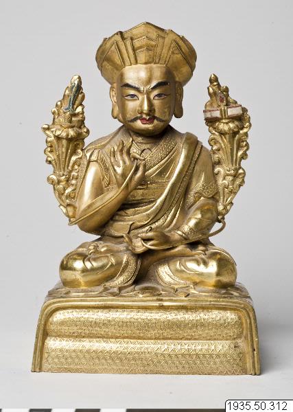 Den här skulpturen återger Lalitavajra med en kroppslig defekt. På höger kind bär han en svulst. Också på andra kända framställningar kan han avbildas på detta sätt. Svärdet och boken, som bärs upp av blomstänglar, anger honom som en manifestation av bodhisattvan Manjushri." (Vem är vem i bildvärlden, en text till utställningen Bilder av Buddha, 1997.)