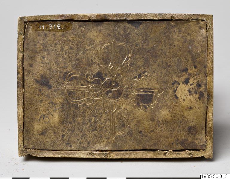 Skulpturen är gjuten i brons/mässing, och är brännförgylld. Tron och dräkt har graverad dekor. Skulpturen är fylld och försluten med en bottenplatta av mässing graverad med en korslagd vajra. Ögon, ögonbryn och mustasch är svartmålade, munnen är rödmålad, svärdet är blågrönt. (AA)