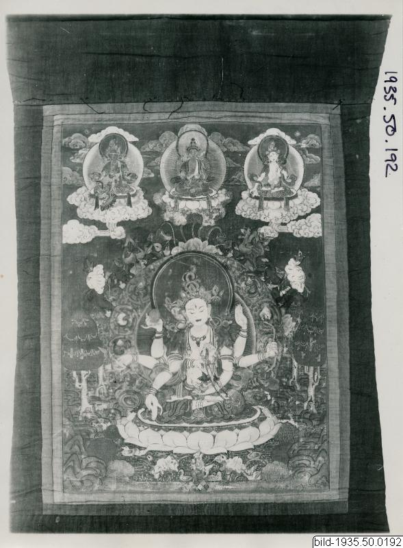 • "Tanka. Centralfigur Ushnishavijaya." (MLK) Själva bilden (A) utskuren och överlämnad till J Jacobsson 1949 enligt lista över bortbytta föremål i Hedinpärmen. "Ramen" (B) finns kvar.
