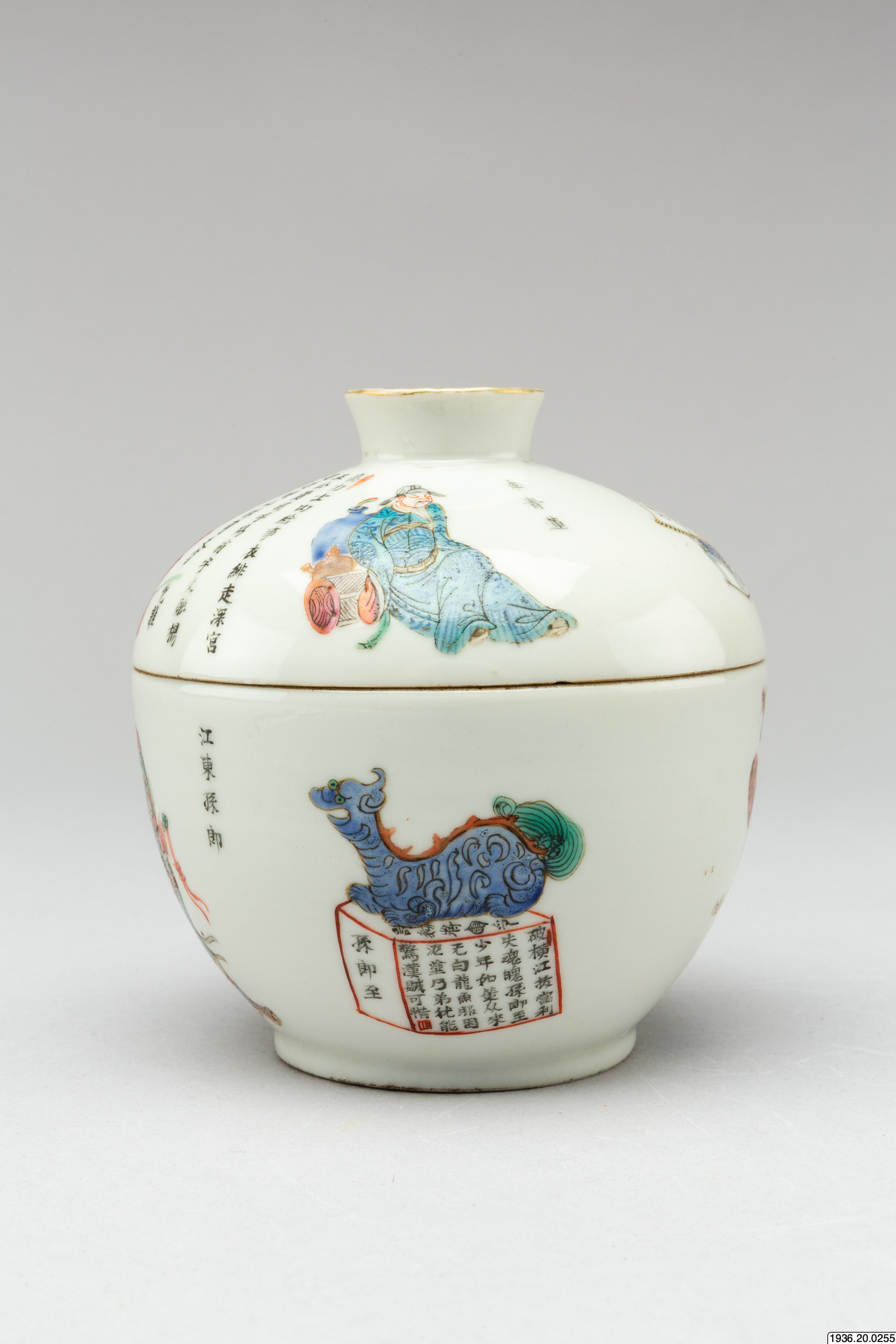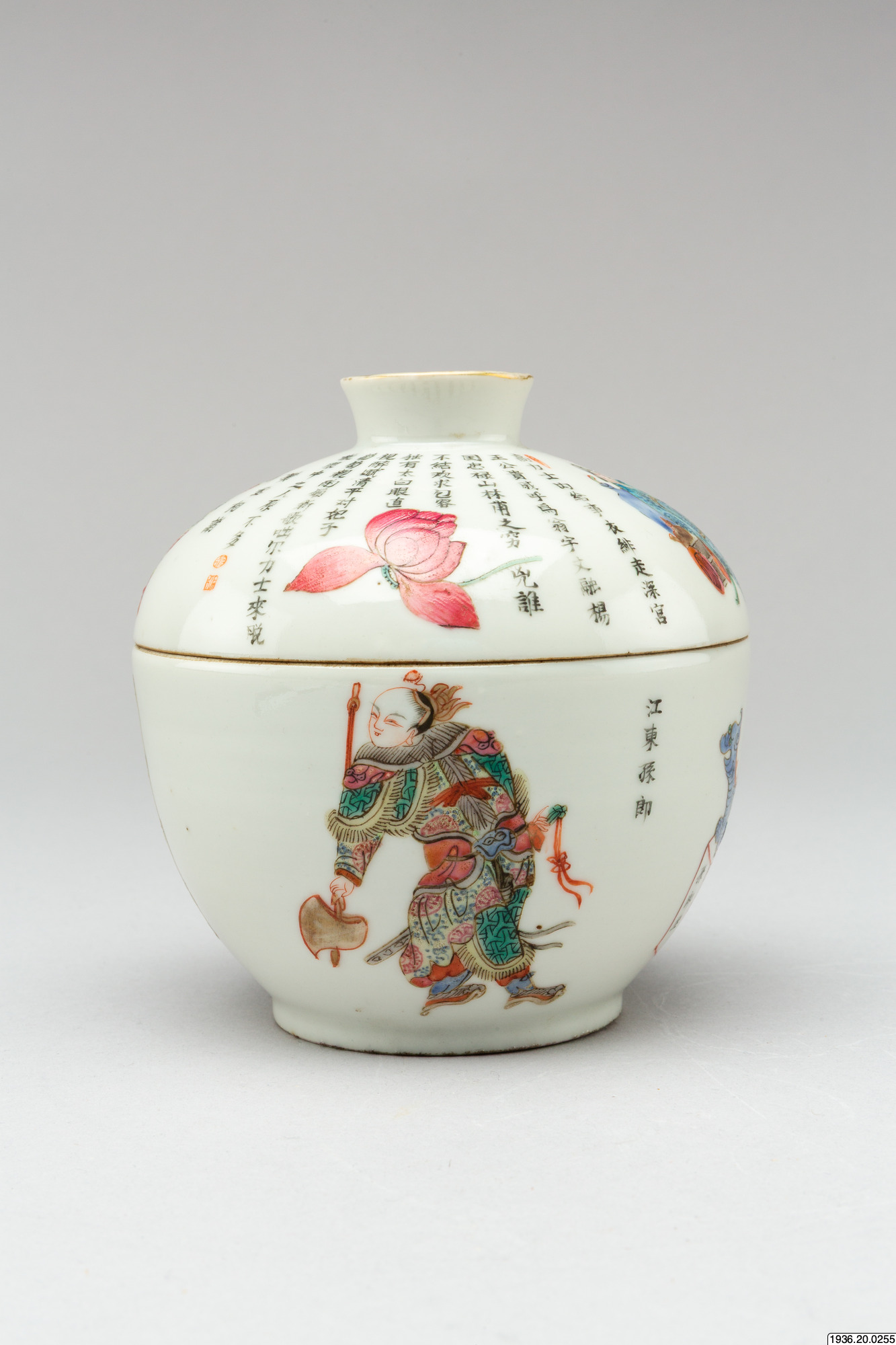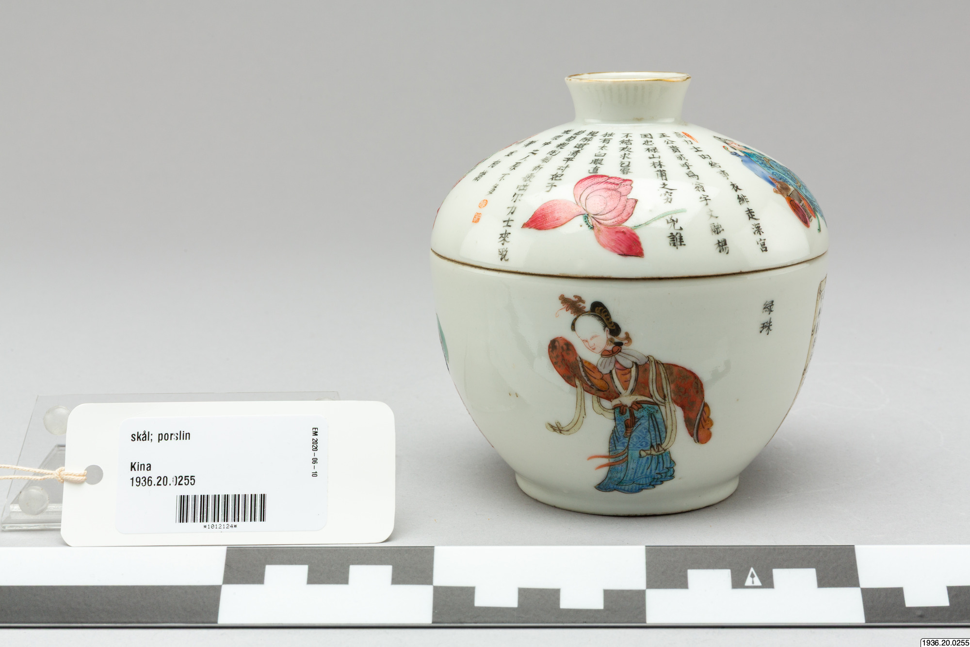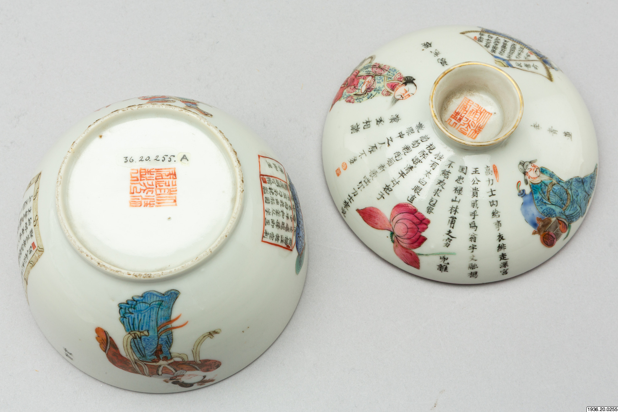 Skål med lock av porslin dekorerad med emaljfärg. Motivet utgörs av figurscener och kinesisk berättande text. Skålen har en stämpel i botten och på lockets ovansida.