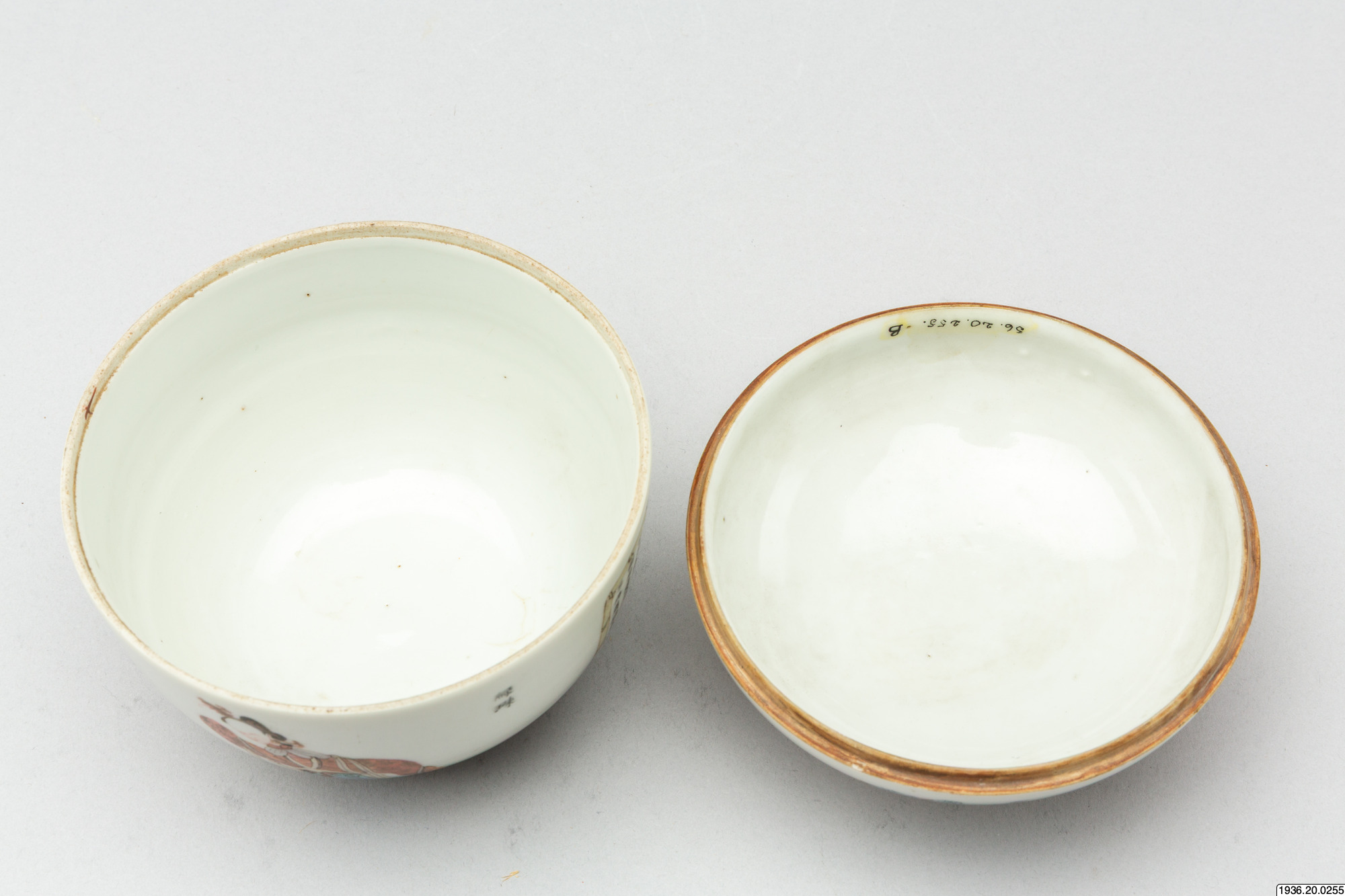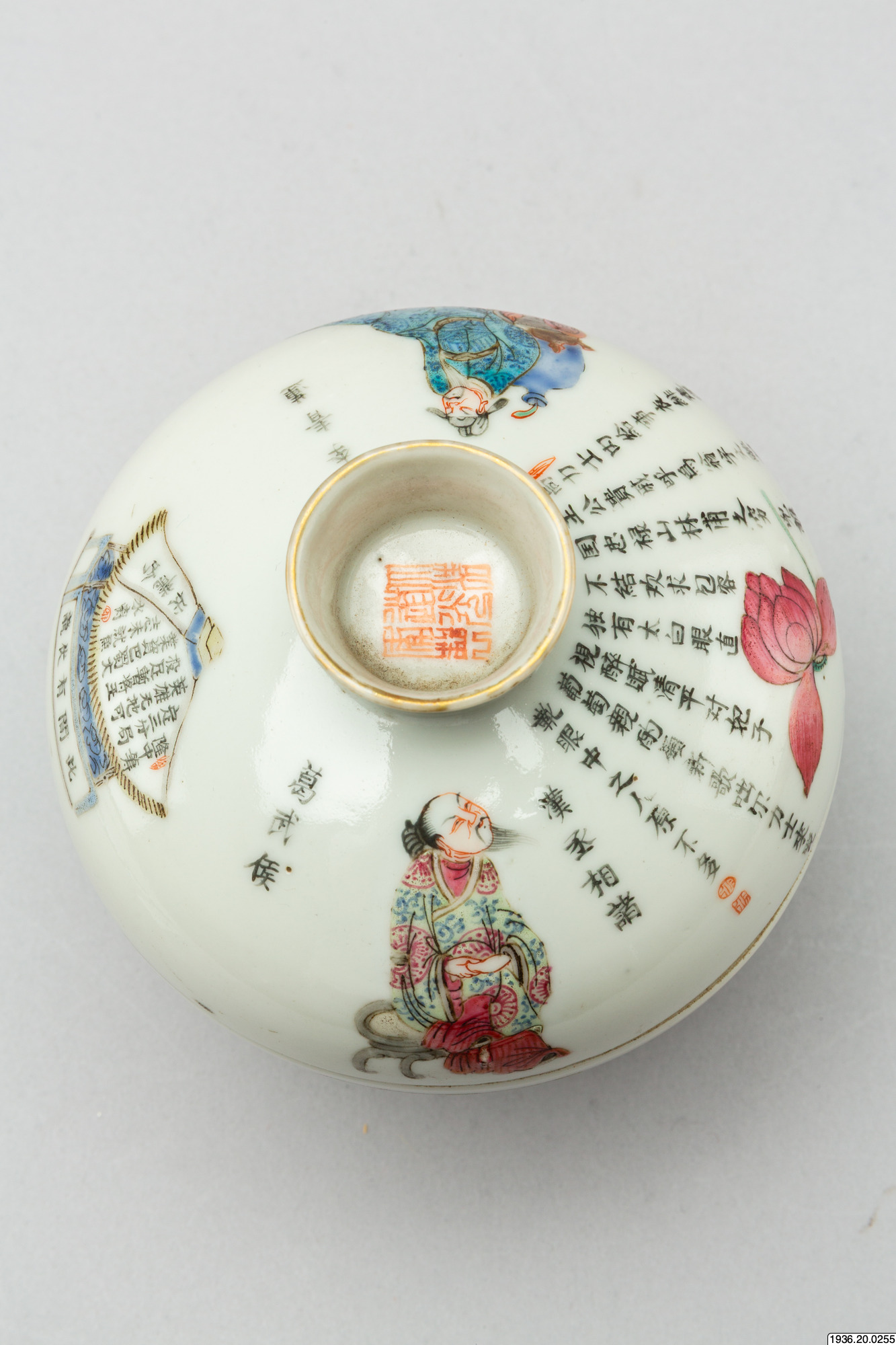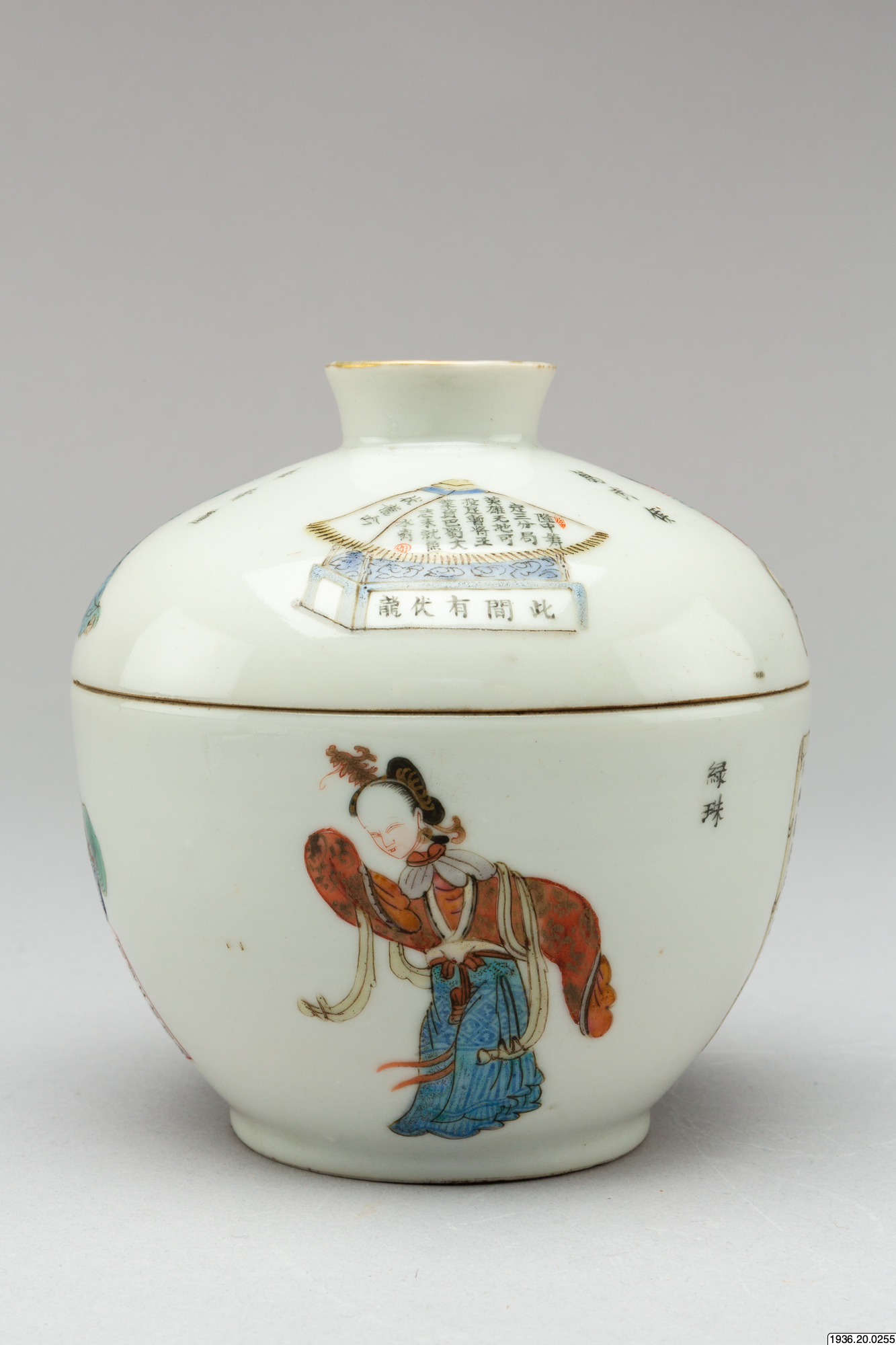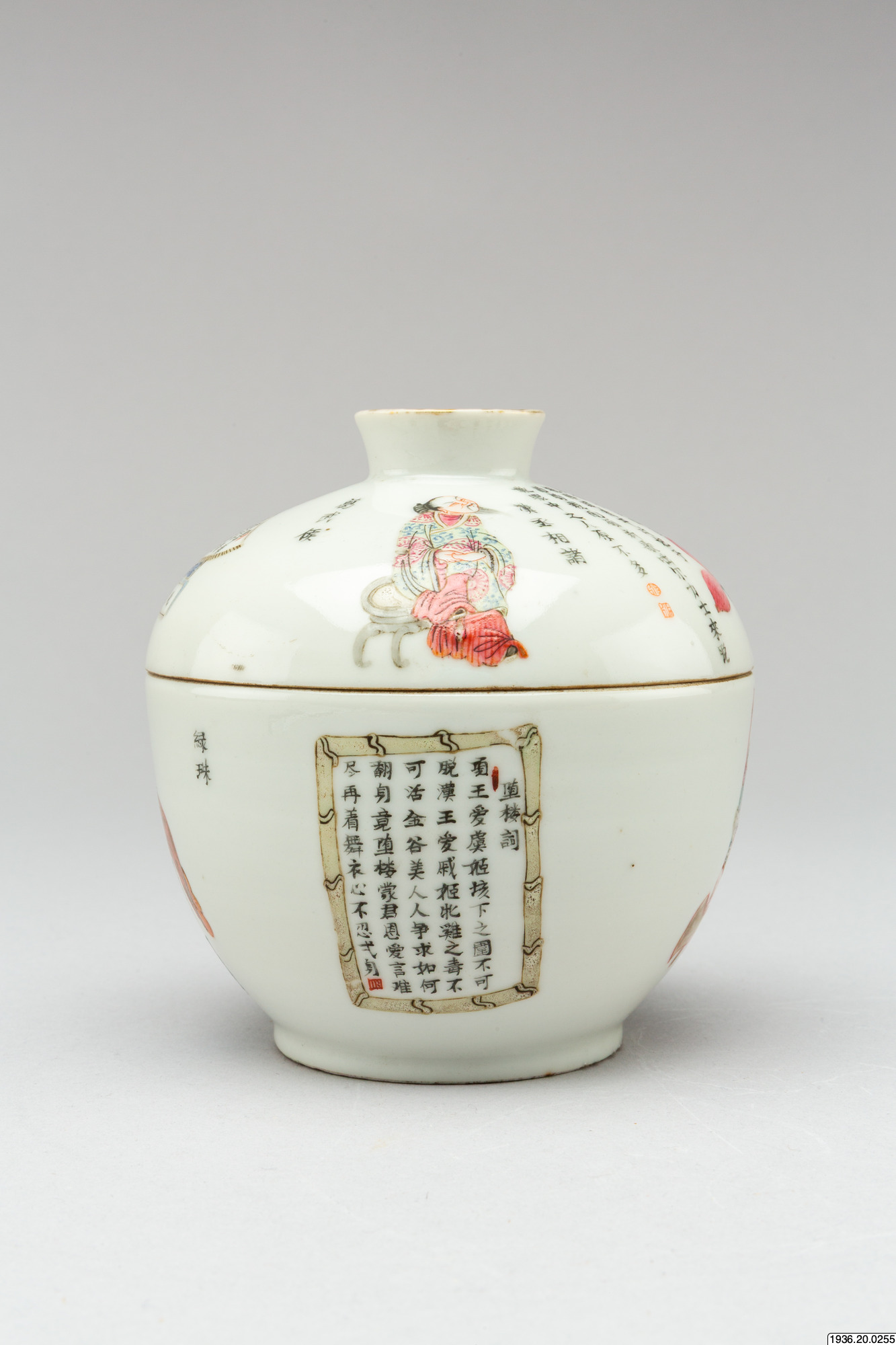 Skål med lock av porslin dekorerad med emaljfärg. Motivet utgörs av figurscener och kinesisk berättande text. Skålen har en stämpel i botten och på lockets ovansida.
