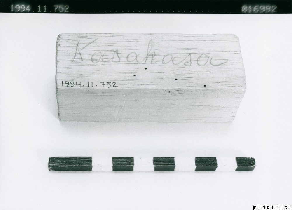 • En träbit i ett ljust träslag. På biten står "Kasakasa" skrivet i blyerts. Enligt en medföljdande lapp rör det sig om ett prov på ett träslag och dess lokala benämning. Jämför med 1994.11.753-762.