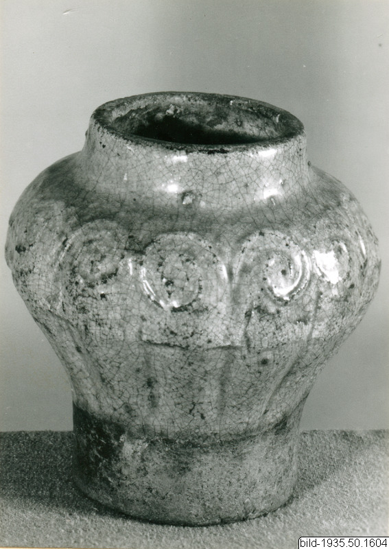 Två vaser av drejat glaserat lergods. Var vas har drejats i två delar som sedan sammanfogats. Vaserna har blå glasyr. Vaserna är försedda med papperslappar med kinesiska tecken i botten. (AA)