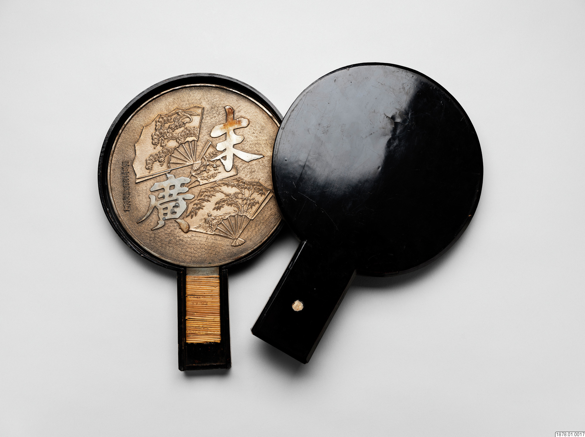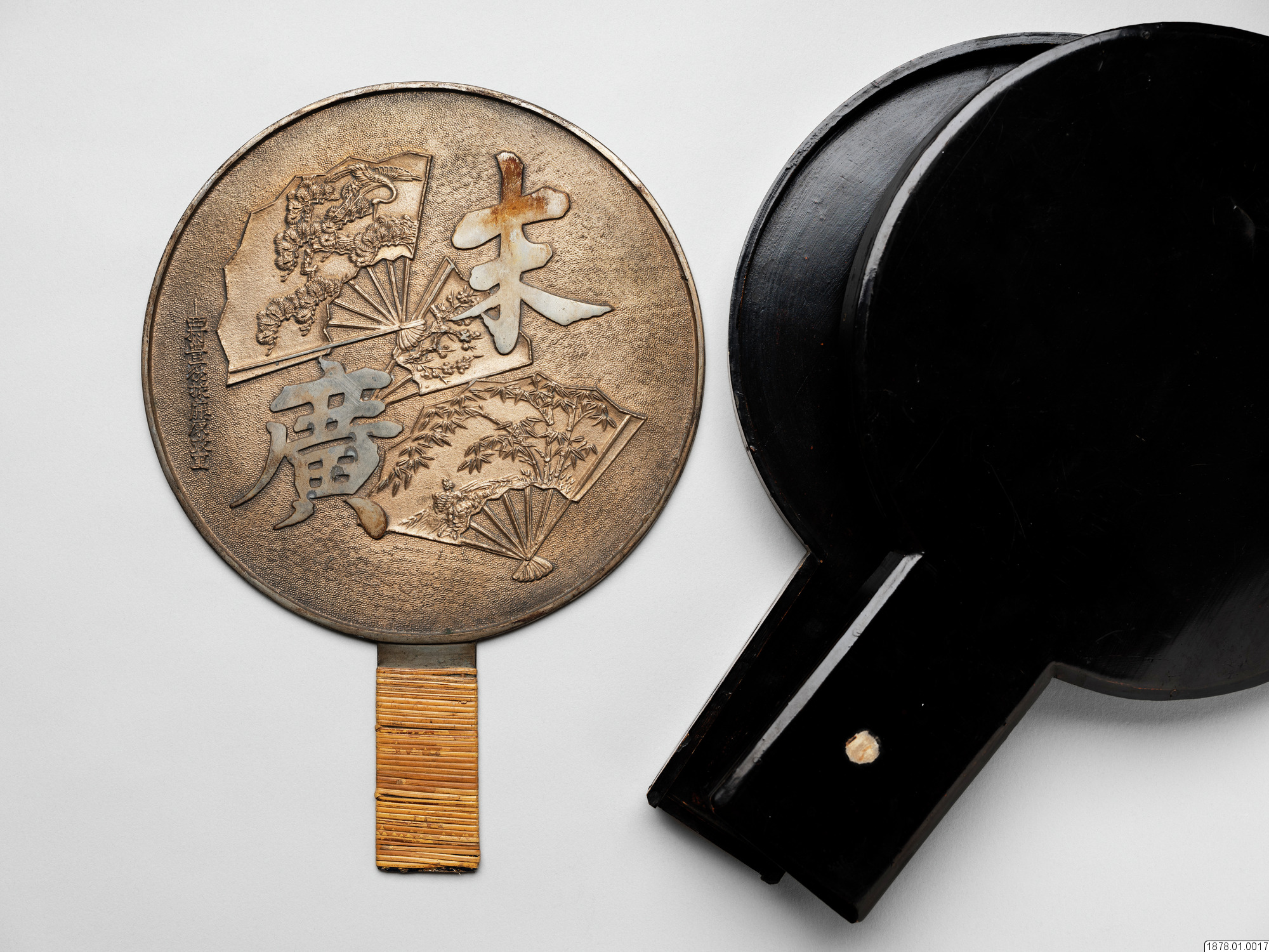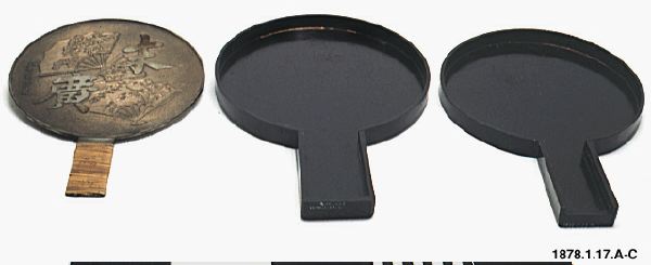 Spegel, enligt katalogen sk trollspegel, i svartlackerat träfodral. Dekorerad på baksidan med solfjädrar innehållande minogame (sköldpadda) och bambu, plommonblom, trana och tall. Lång inskription på vänstra sidan och två stora karaktärer. Spegeln är av typisk form med rottinglindat handtag och lägst ut är spetsen täckt av kinran (guldbrokad på mörkblått siden). Fodralet är på undersidan dekorerat med nashiji-lack. (PH)