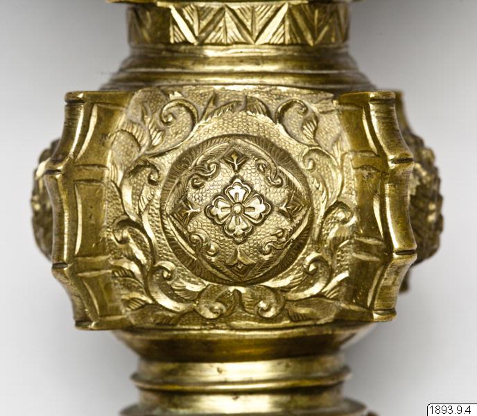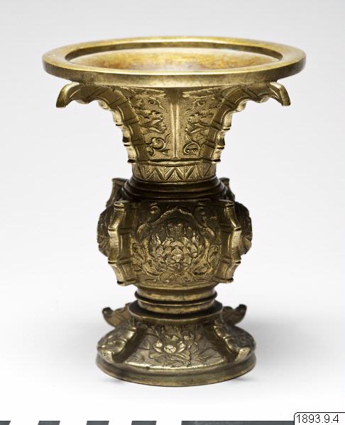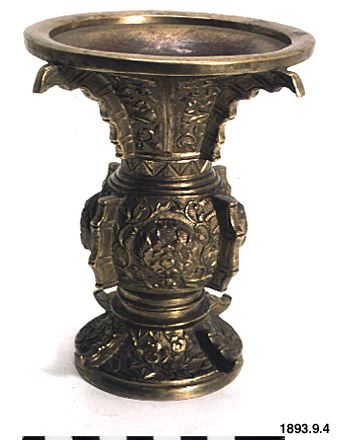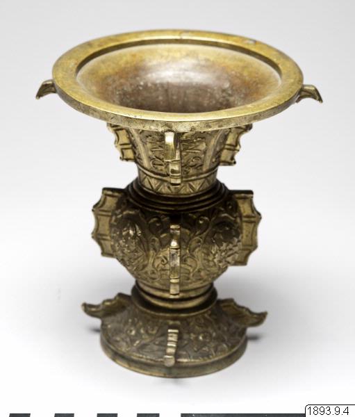 • Vas av enligt katalogen ljus brons (?) med stark inspiration från Kina, formen liknar kinesiska bronser. Troligtvis tillverkad under Meiji-perioden (1868-1912). (PH)