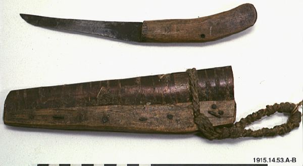 Kniv med fodral/balja av näver och trä med snöre av växtfiber. Kniven har ett inskuret märke på skaftet. Baljan enligt katalogen av körsbärsnäver. Det finns flera baljor hos Ethnologica band 12 1987, bl a s 49-50 nr 10-13, där de kallas "makiri" (oavsett om det är Sachalin eller Hokkaido). I Chuzaburo Tanaka 1992 s 21 nr 70037-44 liksom i Ryosho-ji Shiryo 1993 s 52 nr 72126-28 finns några exempe...