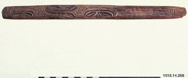 Mustaschlyftare av trä med skuren dekor. Ur katalogen: "Användas vid sakédrickning, dels till att lyfta mustascherna, dels till att doppa i sakékärlet och så kasta några droppar till offer åt gudarna, först framåt till eldgudinnan, så mot höger till "den store anden" (Kamui) och så mot vänster till Yotsisuné (en heroiserad japansk furste, som på 1100-talet blev fördriven till Ainu på Hokkaido)."