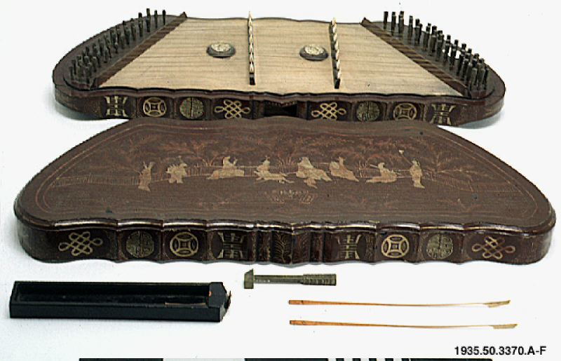 Cittra av brunlackat trä. Cittran har lock, vilket på utsidan är dekorerat med de åtta odödliga. På insidan är locket svart. Cittrans kant och lockets kant är dekorerat med shoutecken och evighetsknutar. Två dekorationer av ben finns på cittrans ovansida under strängarna. Ovan strängarna ligger två stickor/klubbor med vilka instrumentet spelas. I en liten utdragbar låda med mässingsbeslag ligger e...