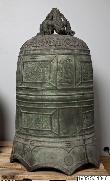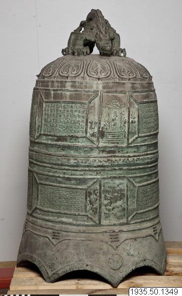 • Klocka gjuten i brons. Fästet upptill är i form av en drake. Runt denna finns dekorationer av tolv stiliserade kronblad av lotus. På klockan finns kinesisk skrift. (AA)