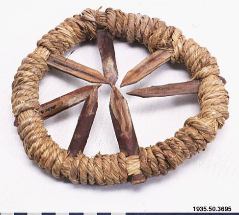 Fälla. (MLK) "Trampfälla av trä och halm." (HBE) Fällan är i form av en ring med sju taggar av trä som riktas inåt mot ringens mitt. (AA) Teckning i HBE.