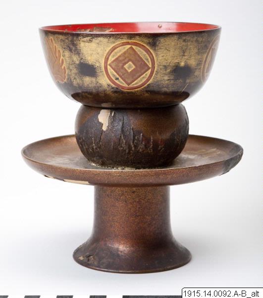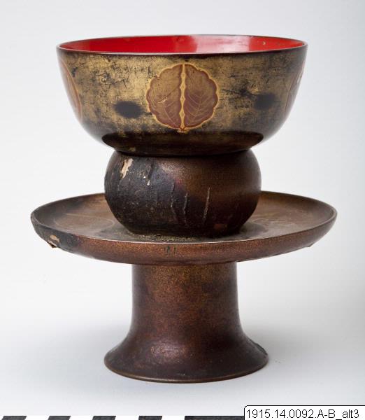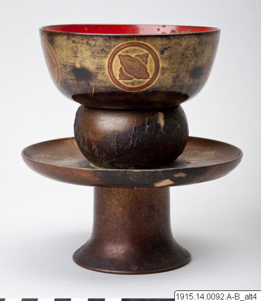 Skål på ställ, av lackerat trä. Skålen har rödlackerad insida och dekor av björn i hiramaki-e (där guldet nästan helt försvunnit så den bruna underfärgen framträder) och på utsidn hiramaik-edekor av olika familjevapen (mon), bl a i form av fjäril. Stället är på insidan svartlackerat och på utsidan nashiji-dekorerat och prytt med fem mon, bl a kiri-mon (paulownia). Japansk tillverkning.