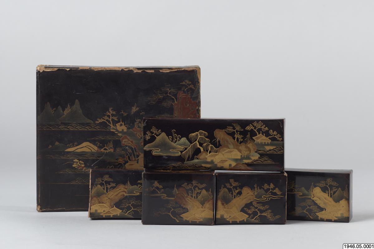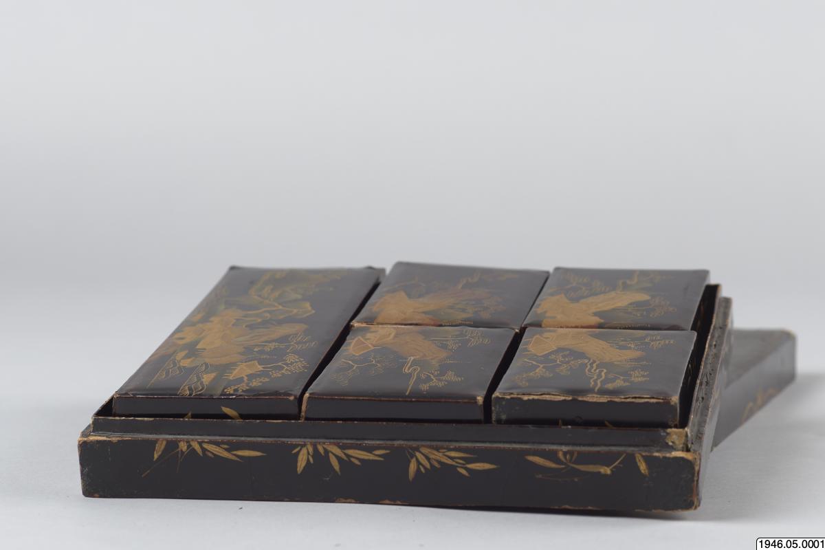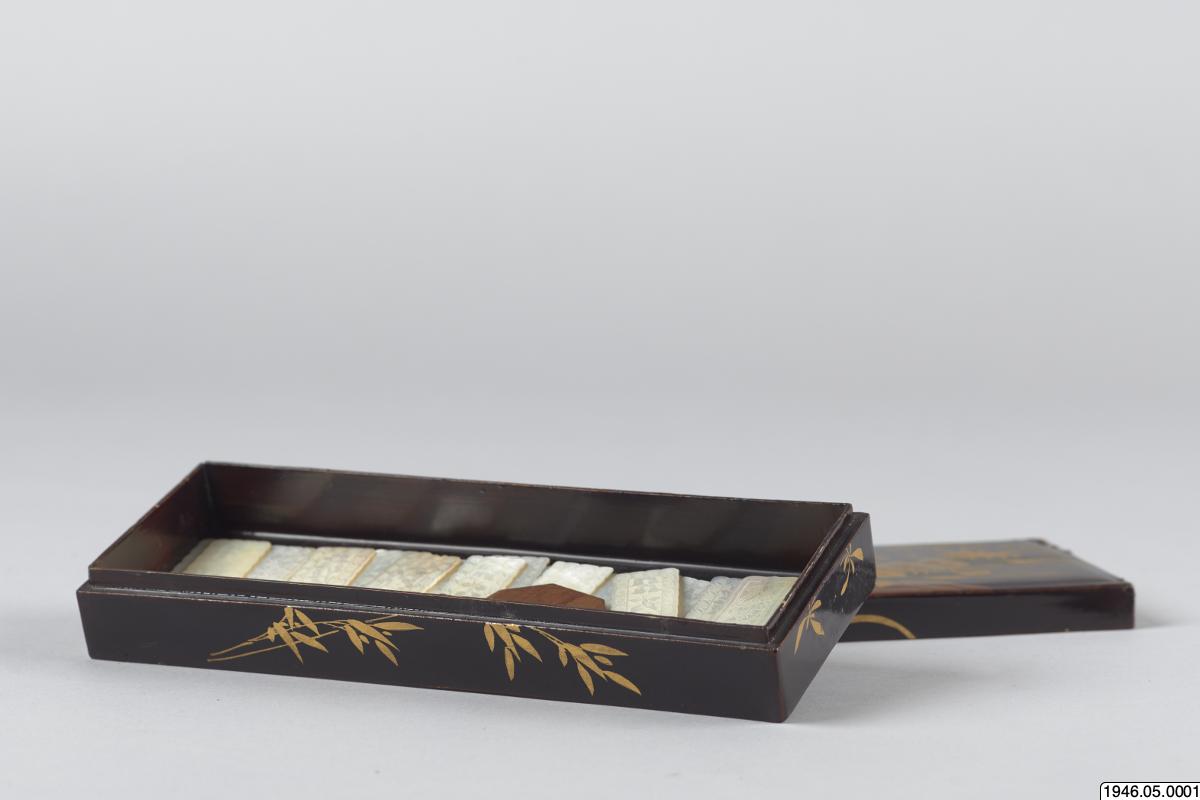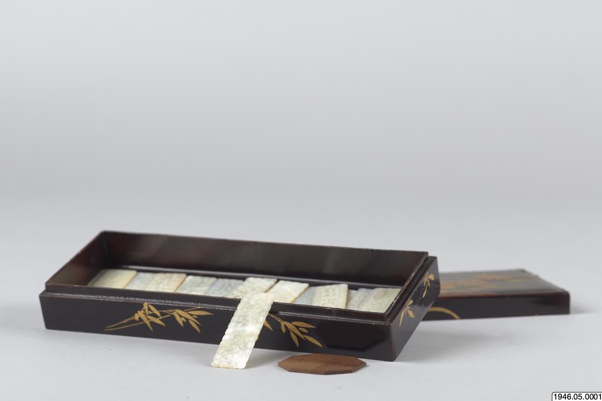 Ask i svart lack dekorerad med landskap i guld och rött. Asken innehåller fem mindre askar dekorerade på samma sätt, innehållande marker av pärlemor. Lacken är mycket sprucken. För vidare information se delobjektsbeskrivning. Enligt kataloguppgift säkerligen ett sydkinesiskt arbete, avsett som exportvara. Markerna användes för att räkna poäng i olika spel, och gjordes som exportvara då kineserna...