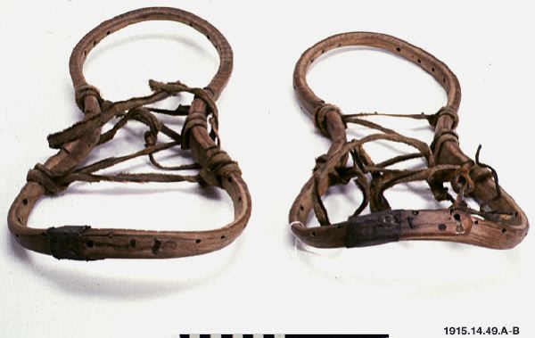 Snöskor med ramar av trä, hopfästa framtill med spikad metallplåt. Hål på ramarna för fästning av tvärgående band till stöd för foten. Bindremmar av läder delvis med håret på. (generalkatalogen)