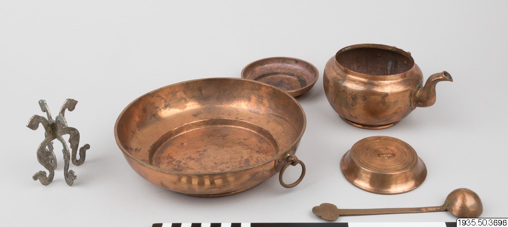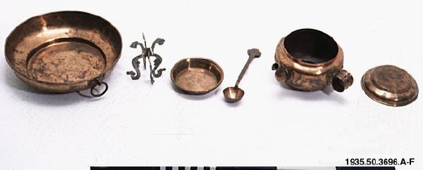 "Samtliga av dessa föremål är nytillverkade 1931. Användes vid den enskilda kulten. Vattenoffer varvid gudabilden överöses med vigvatten." (HBE)