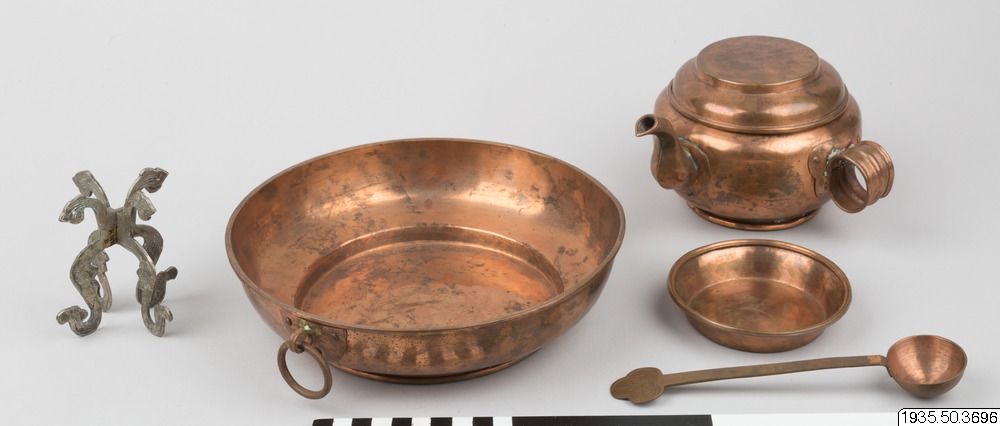 A. Fat/skål av koppar av driven koppar. Skålen har en upphängningsring.