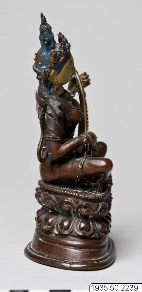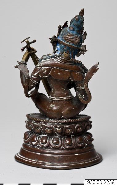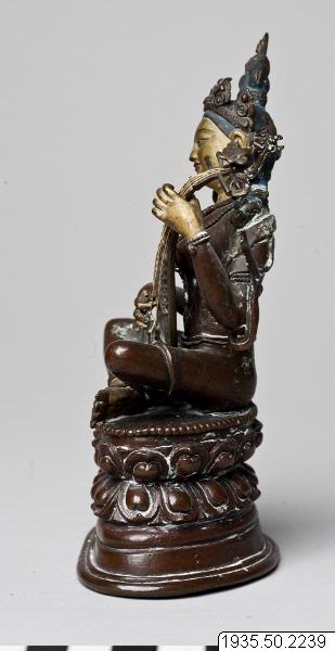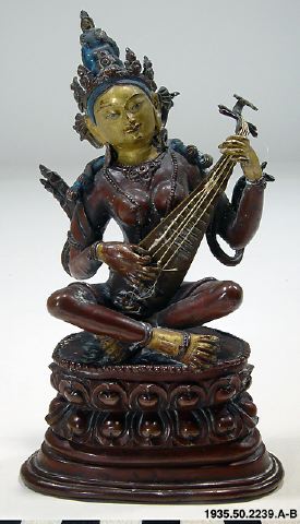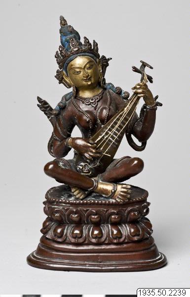 Skulptur: Sarasvati (Chandra, Lokesh. 1987. s.148, nr. 292) Sarasvati sitter på en hög lotustron. Hon är smyckad med örhängen, halsband, fotringar och stolaband. Hon bär en femuddig krona, och hårslingor faller ner över hennes axlar. Mudra och attribut. Sarasvati spelar på en luta. Lutan har i nuvarande skick trasiga strängar. (Strängarna återfästes, mars 1997) Skulpturen är gjuten i kopparhaltig brons. Ansikte, händer och fötter är kallförgyllda. Håret är blåmålat. Skulpturen är ej fylld och försluten. (AA) "Sarasvati Tib. dbyangs can ma Musikens och konstens gudinna. Patinerad brons. Tibet/Kina, 1700-tal." (Föremålstext till utställningen Bilder av Buddha.) "Sarasvati har sitt ursprung i den vediska gudinnan Vac, talets gudinna. I hinduismen är Sarsasvati beskyddare av talekonst, konstdiktning och musik. I mahayanabuddhismen har hon behållit samma funktion, och den som skänker henne sin vördnad blir delaktig av gudinnans talanger. Sarasvati är här avbildad sittande som en sköldpadda, medan hon spelar på sitt stränginstrument." (Vem är vem i bildvärlden, en text till utställningen Bilder av Buddha) "Sarasvati (Bronze)." (Gomboievs katalog) Foto i Gomboievs katalog och i HBE.