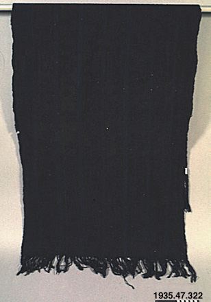 Rebozo av ullgarn. Bottenfärgen mörkt brun med parvis ordnade smala blå ränder i varpen. Avsedd för vardagsbruk. Heter på taraskiska cuaníndicua zunúnda. Tillsammans bildar 1935.47.317-324 en fullständig taraskisk kvinnodräkt. [[Etno]]