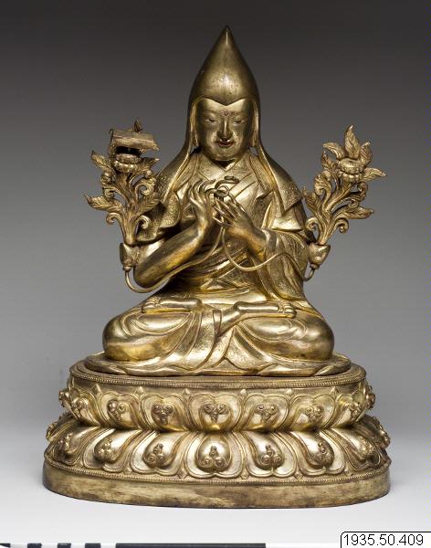 Skulptur: Tsongkhapa āsana: Tsongkhapa är avbildad sittande i meditationsställning (dhyanasana) på en lotustron. Mudra och attribut: Tsongkhapa har sina händer i hjulvändargesten (dharmacakramudra). Han håller i stjälkarna till två lotusblommor som reser sig vid hans axlar. På lotusen vid hans högra axel finns en bok. På den andra lotusen har sannolikt ett svärd en gång suttit. Skulpturen är gjuten i brons och är brännförgylld. Mun och urna har målats röda. Ögonen har målats svarta och vita. Dräkten har graverad dekor. Skulpturen är fylld och försluten med en bottenplatta som graverats med en korslagd vajra (vishvavajra). (AA) "Gudabild av mässing. Tsonkaba?" (MLK) Foto i HBE visar Tsongkhapa utan sin bok.
