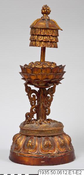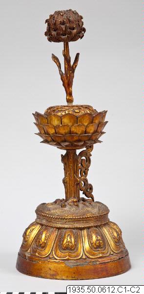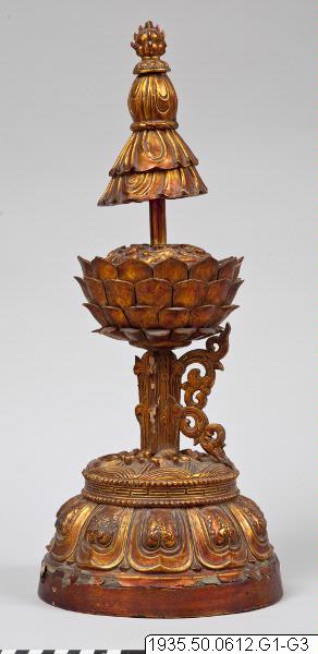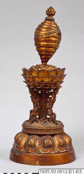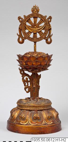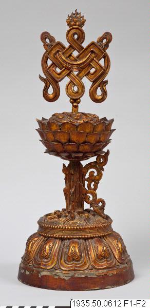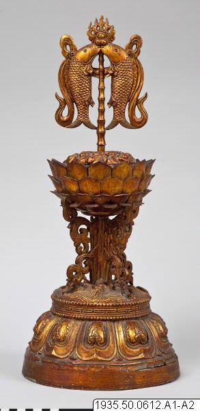 Altaruppsats med åtta pjäser av trä, vilka överdragits med guldlack. Foten är dekorerad med tio stiliserade kronblad av lotus som uppbär vatten eller vågor. Lotus på skaft uppbär de åtta buddhistiska emblemen: tvillingfiskar, snäcka, segerbanér, vas, parasoll, evighetsknut, lotus och lärans hjul krönta av flammande juveler. Skaften är försedda med dekorationer på fyra sidor. Undersidan har ej förs...