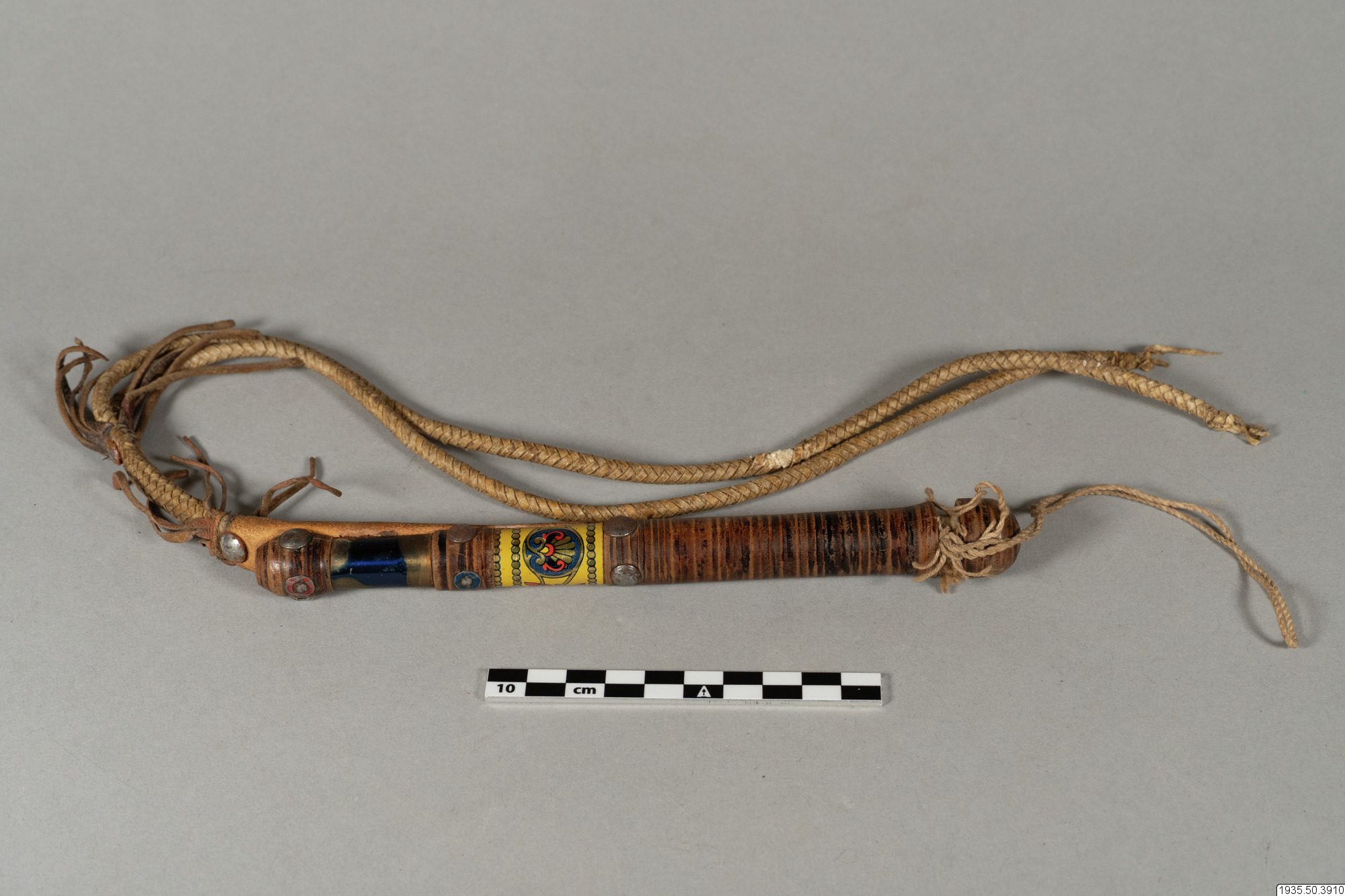 Ridpiska. (MLK) Piskan har ett skaft av trä, med metallbeslag, och dekoration i gult. (AA)