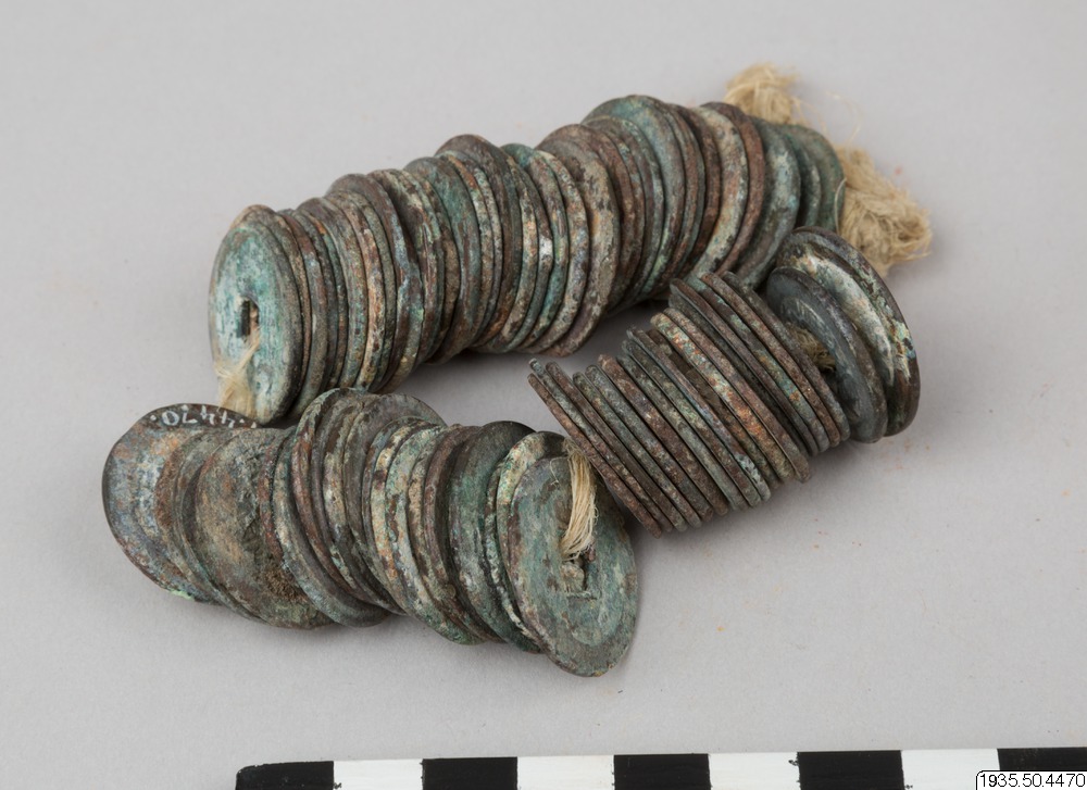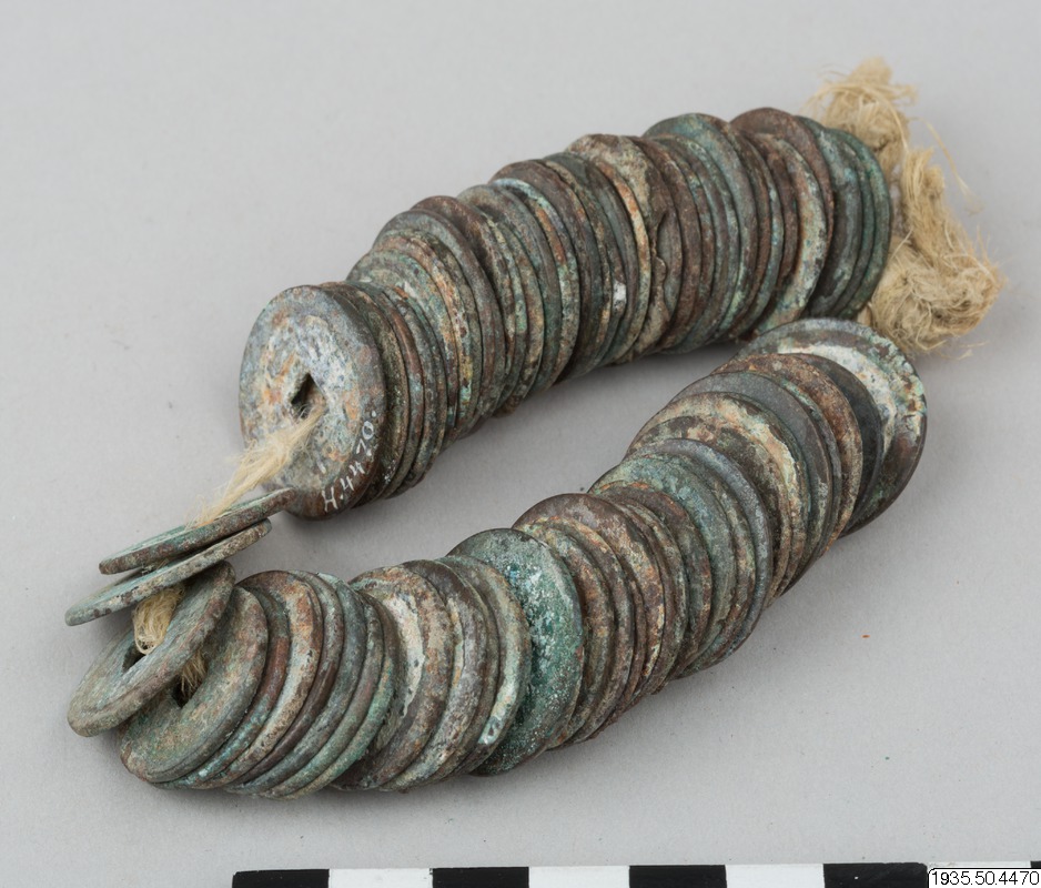 The final years of the 1927–35 Swedish–Chinese expedition to Central Asia were financed by the Chinese government with an eye to exploring the possibilities of building automobile roads along the former caravan routes. Astronomer Nils Peter Ambolt, who participated in the early years, from 1927 to 33, collected these old coins, threaded onto twine.