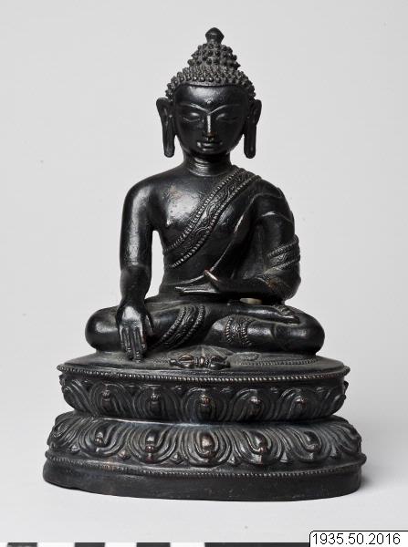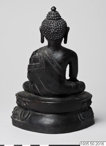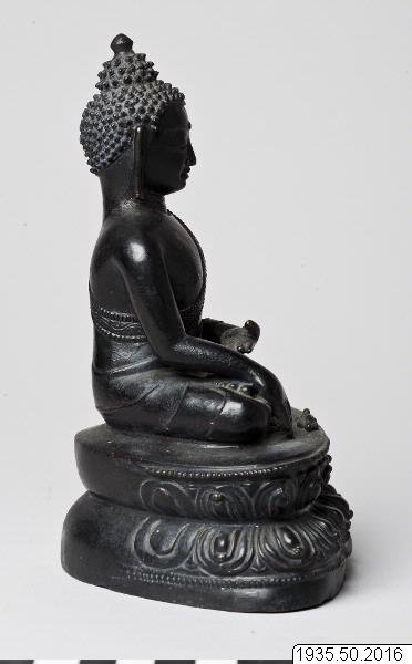 Mudra och attribut: Han har sin högra hand i jordberörelsens gest (bhumisparshamudra) och si...
